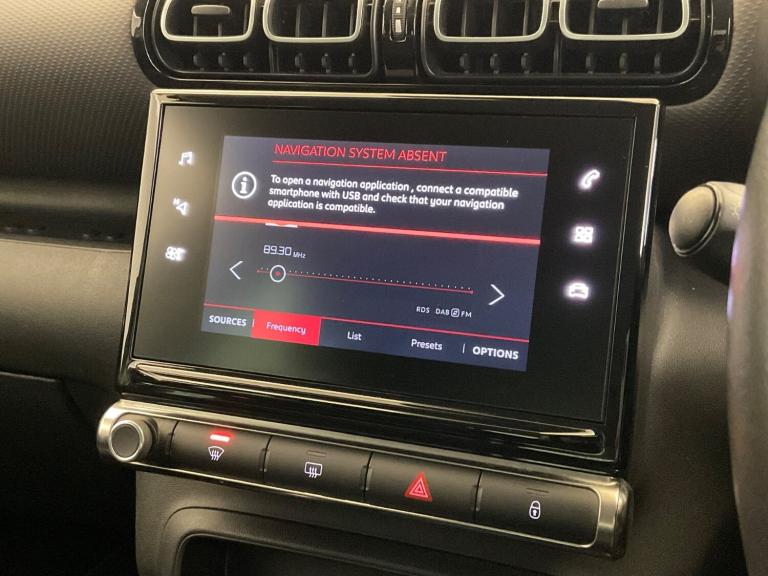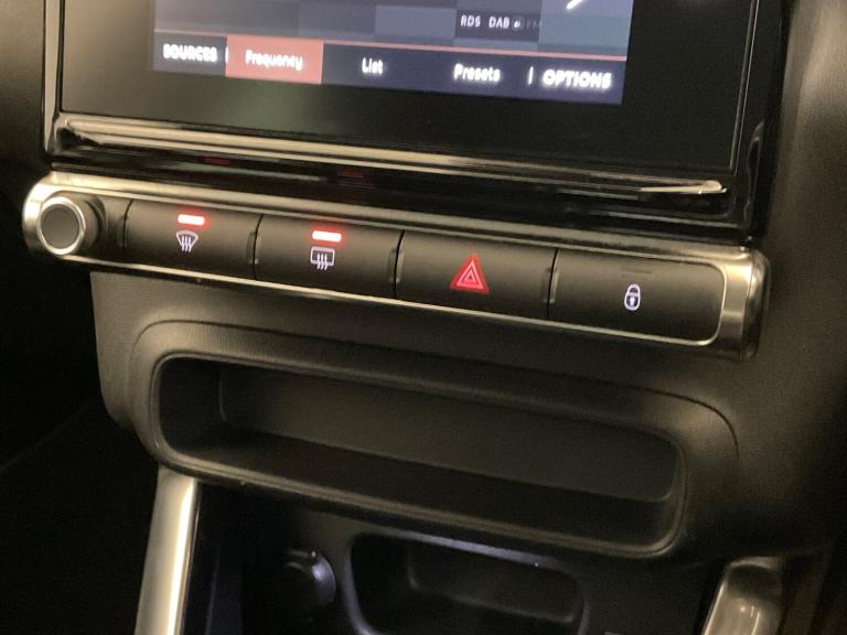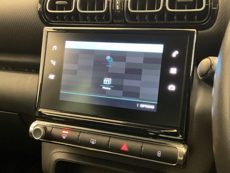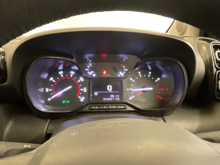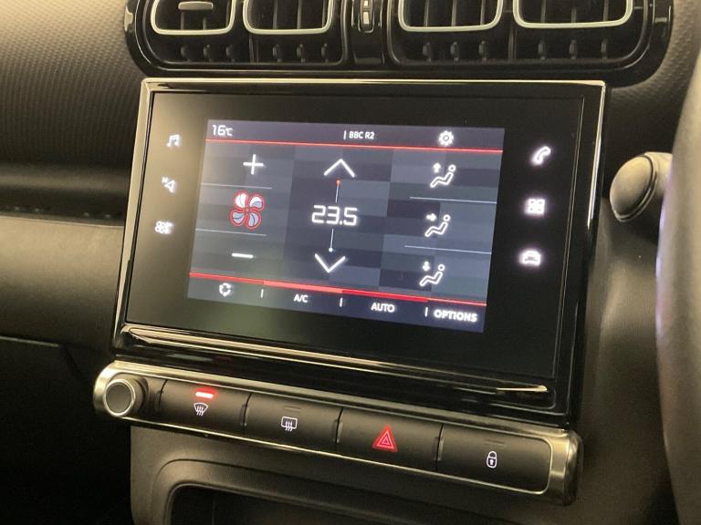 ..7'' Capacitive colour touchscreen, Coffee Break Alert, Cruise control with speed limiter, Driver instrument cluster including trip computer and rev counter with white text LCD display and white needles, eCall emergency call system, Lane departure warning system, Mirror screen with Apple CarPlay and Android auto, Outside temperature sensor, Rear parking sensors, Tailgate, Traffic signs and speed limit recognition and recommendation, Variable assistance power steering, Bluetooth hands free and media streaming with USB socket, Citroen connected DAB radio with 6 speakers, Steering wheel mounted controls for stereo and telephone, 3D C-series embossed exterior signature, 3D effect LED rear lights, Automatic Eco LED headlights, Automatic lights and windscreen wipers, Black roof bars, Body colour painted door handles, Chrome chevrons front grille, Electric front windows + one touch + anti-pinch, Electric rear windows with one touch/anti-pinch, Electrically adjustable door mirrors, Electrically folding door mirrors, Fog lights integrated into front bumper, Front and rear body coloured bumpers, Heated door mirrors, Integrated roof spoiler, LED daytime running lights, LED third brake light, Painted door mirrors to match colour pack, Rear side wing doors, Rear wiper, Tinted rear windows and rear quarterpanel glass, Variable front intermittent wipers, 12V socket in rear of vehicle, 60/40 split folding rear seat, Automatic air conditioning, Boot light, Centre console with open storage, Custom carpet mats, Driver and front passenger cup holders, Driver and passenger sunvisor with courtesy mirror, Front and rear courtesy reading lights, Front and rear door storage, Front head restraints, Gloss black air vent surrounds and steering wheel insert, Glovebox with closable lid, Height adjustable driver's seat, Height and reach adjustable steering wheel, Manual handbrake with chrome insert, Mica cloth upholstery with grey ambience, Passenger compartment headlight adjustment, Rear isofix mounting points (outside seats) with top tether, Row 2 - Three seats with individually adjustable head rests, Satin chrome interior door handles, Single front passenger seat, Soft touch dashboard facia, Anodised bronze exterior colour pack - C3 Aircross, 3 point, height adjustable, pre tensioned front seatbelts, ABS with Electronic brakeforce distribution and Emergency braking assistance, Automatic illumination of hazard warning lights, Curtain airbags, Driver airbag, Drivers/passengers and
