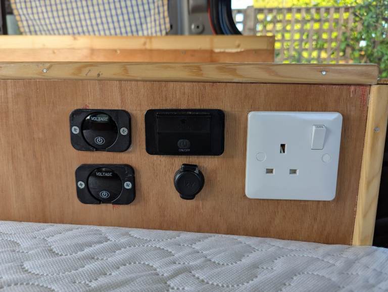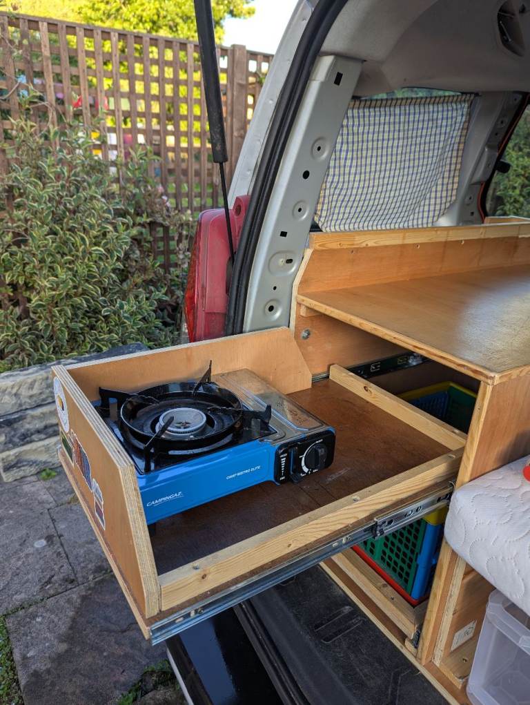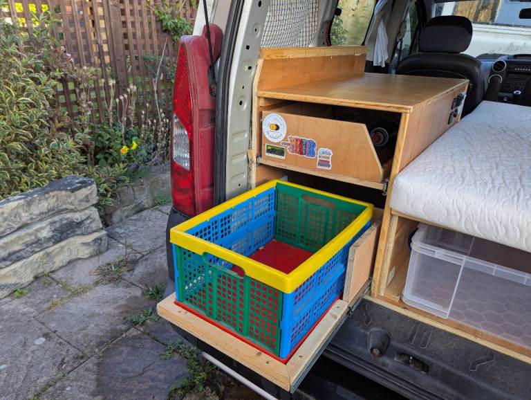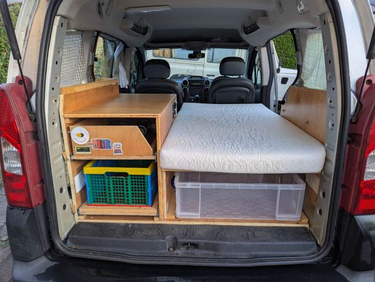 This is a DIY conversion that I completed myself using good quality plywood and a pot of varnish. The main floor and sides are insulated and boarded. There is a bed built behind the driver’s seat that has space underneath for 3 x 50L storage boxes (included). The storage is easily accessible from the side or rear. On the passenger side is a storage unit including a pull out shelf with wind shield for a gas burner and a second pull out compartment for food storage. Behind the passenger seat is a fold away table. Next to the table are two battery voltage monitors, USB charging sockets and a 230V socket running from a 500W inverter. The van electrics are powered from a leisure battery which is in turn recharged when the engine is running. There is an LED light fitted in the back. Extra storage is available (I used it for my Yoga matt, camping stool and camera gear). Curtain wires are fitted to all windows and there is a set of handmade and very funky curtains.