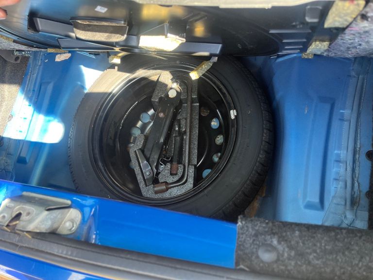 It’s got a touchscreen head unit with Bluetooth for music, comes with a spare wheel and jack, and the engine bay is nice and clean.