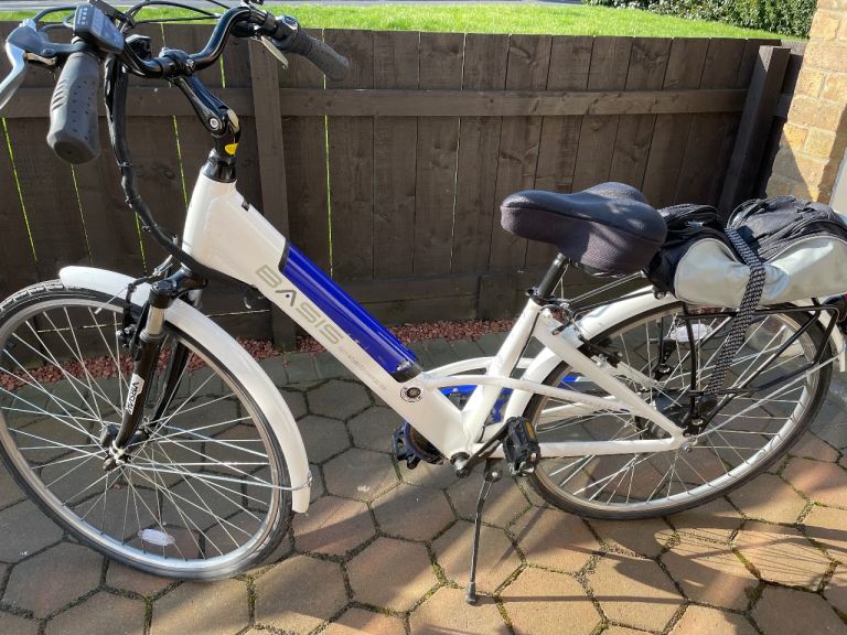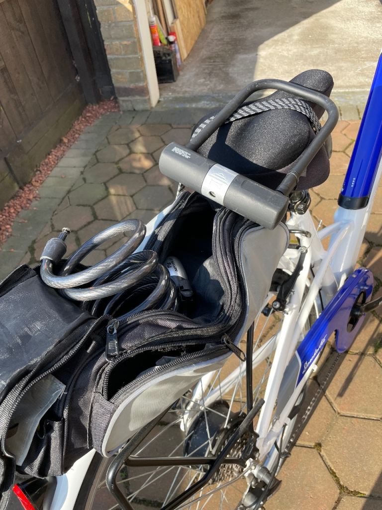 White and blue electric bike with extras bag two good locks tools gel saddle information booklet