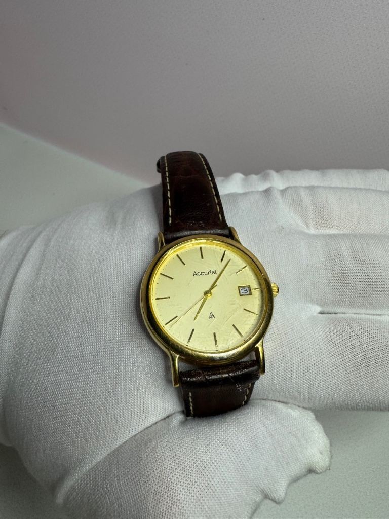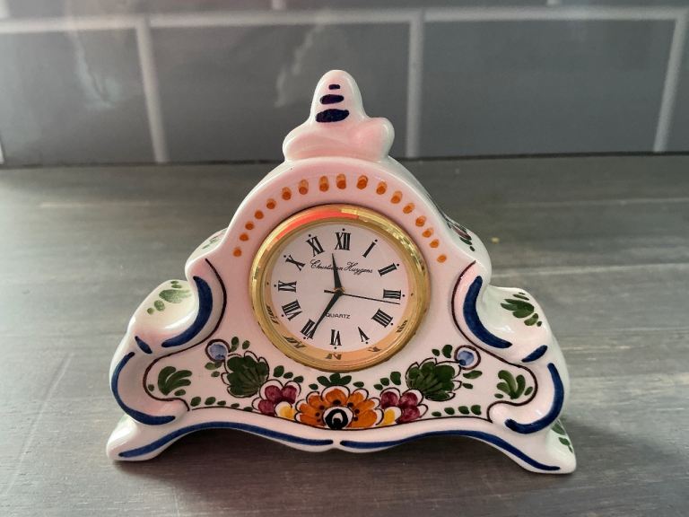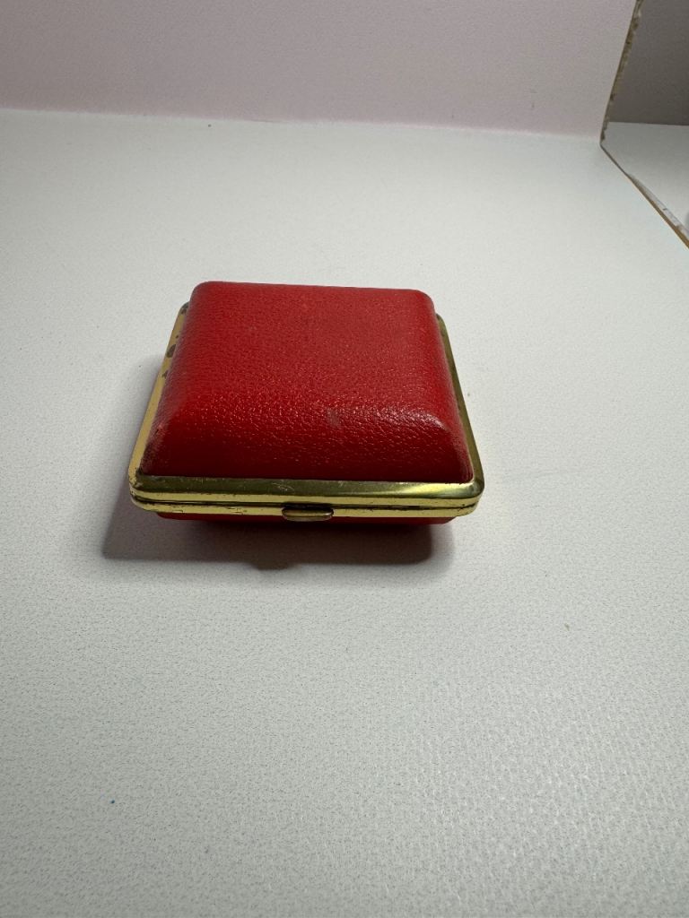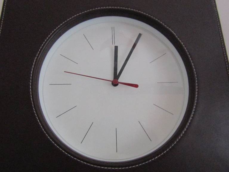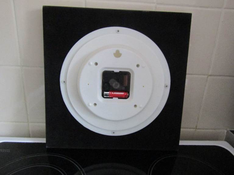 A NICE BATTERY OPERATED WALL CLOCK. WITH LEATHER/SIMULATED LEATHER (NOT CERTAIN). WORKS GREAT! 12 INCHES SQUARE APPROX. USE 1 AA BATTERY. FROM A PET FREE NON SMOKING HOME.
