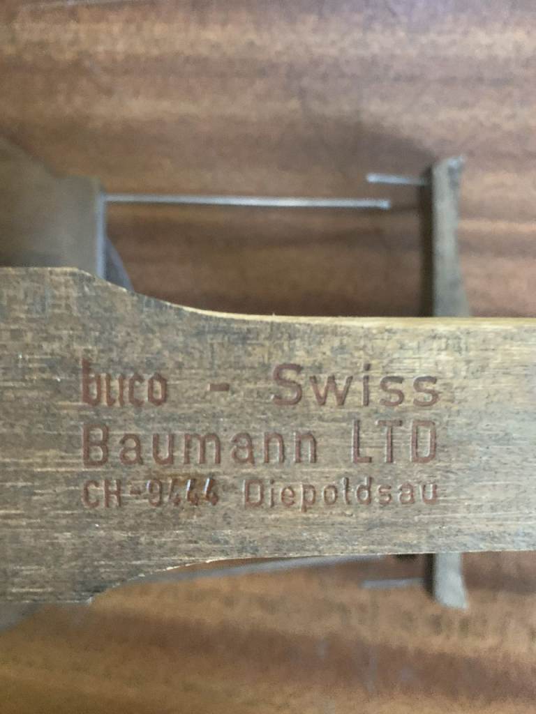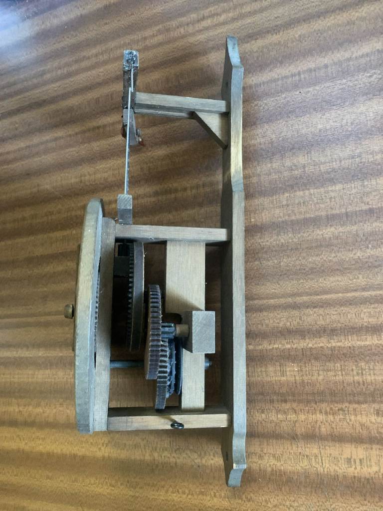 A wooden wall clock, made in Switzerland, model CH-9444, with flying pendulum. Unfortunately there are no weights.