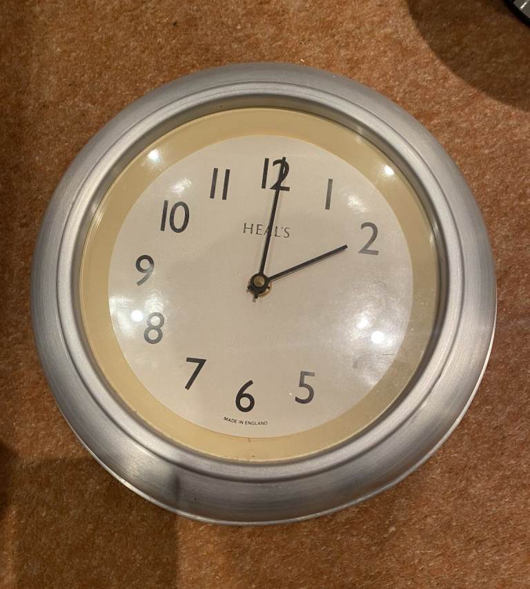 This set features a bold blue clock table and a sleek Heal’s white wall clock, offering both style and functionality. The clock table serves as a unique side table, while the white wall clock adds a clean, modern touch.