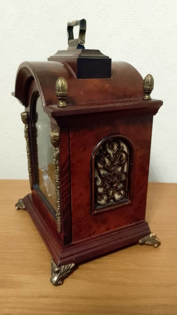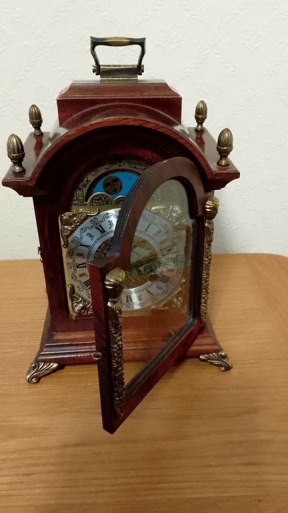 Traditional burr walnut case with brass side decoration. Silver dial with Roman numerals. Gilt coloured centre and corner spandrels. Moon phase eight day clockwork mechanism with key. With original instructions.