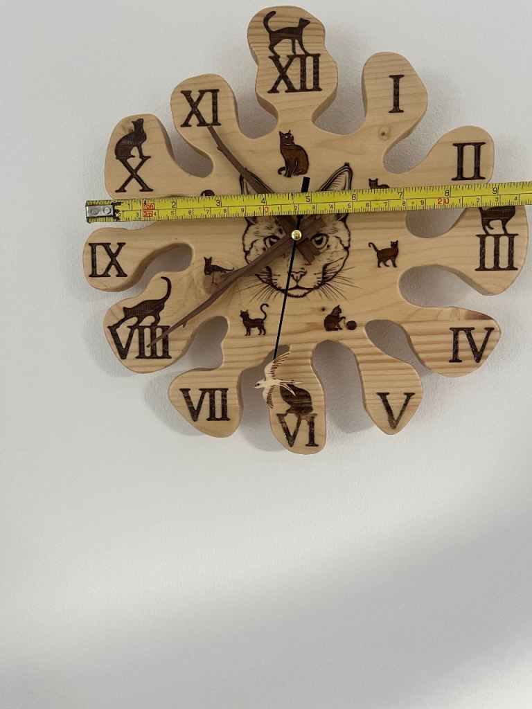 Hand made one-off cat themed clock laser engraved on solid pine with silent movement (free battery) supplied approx 25cm in diameter