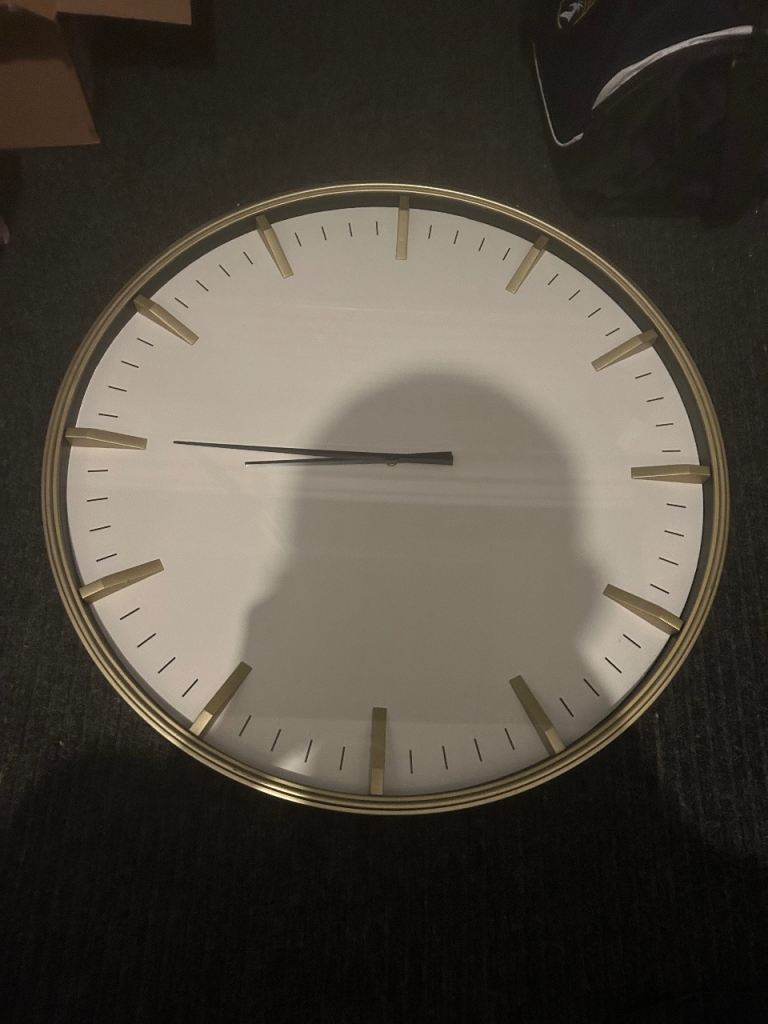Large gold clock. Crack in bottom but can’t be seen when on the wall.