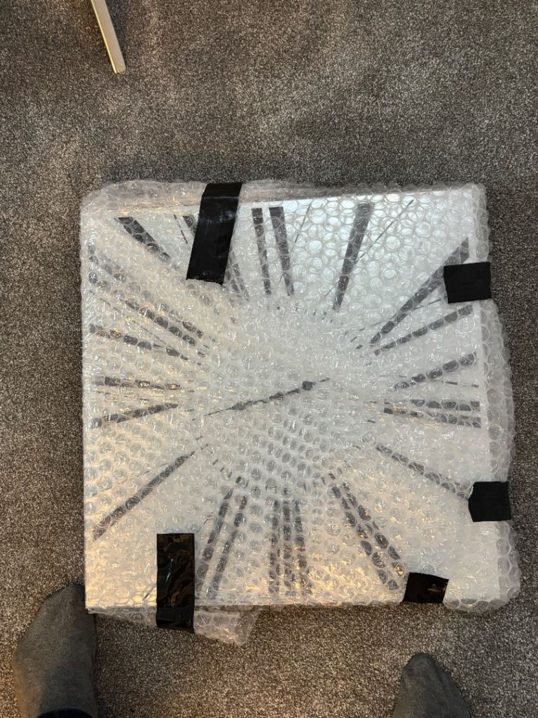 Mirrored wall clock quartz operated. Clearing some of our redundant furniture after move hence sale. Happy to take out of bubble wrap and show buyer on inspection. Size is 21 inch square.