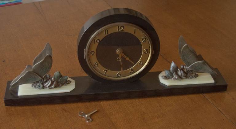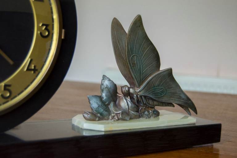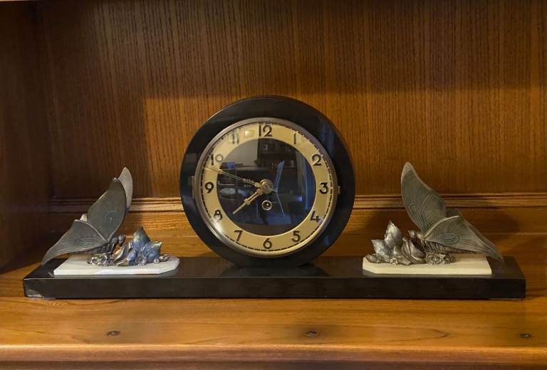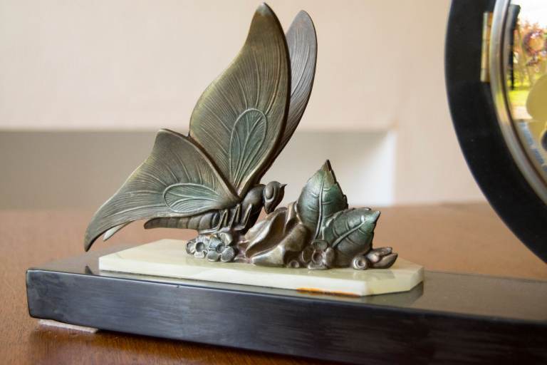 Vintage Art Deco Mantel Clock with elegant butterflies and foliage.