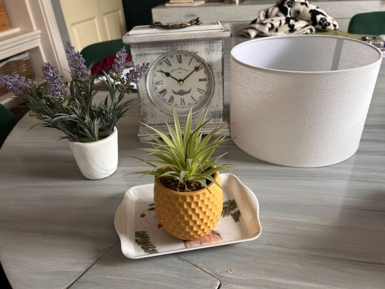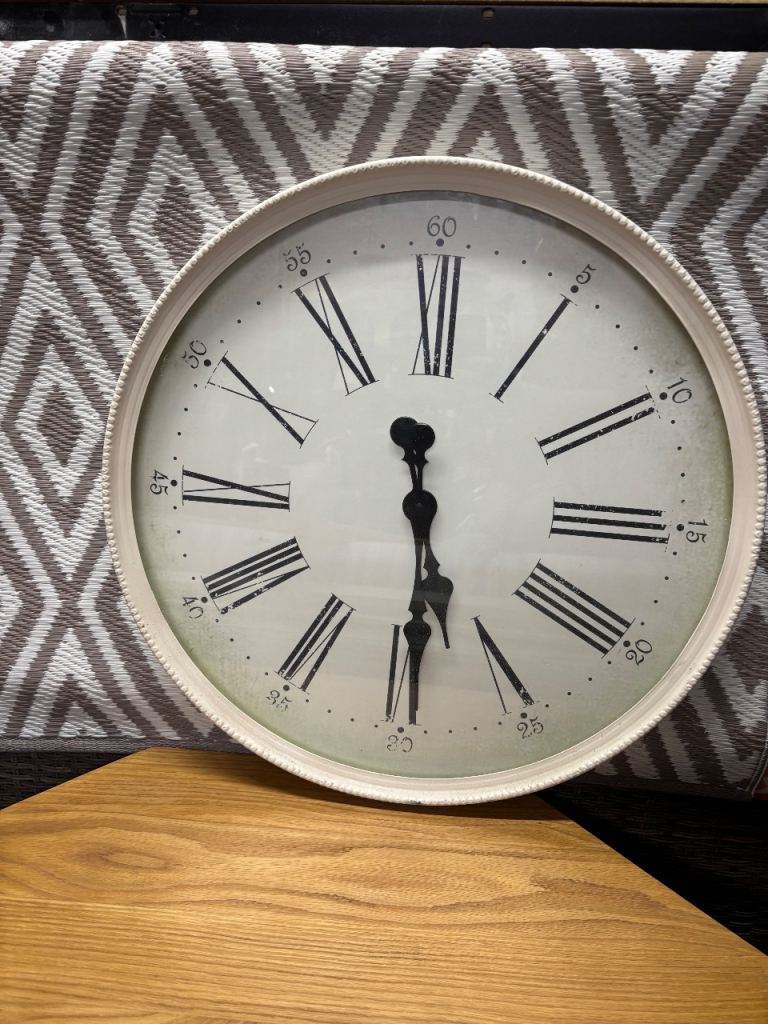 There are two graceful butterflies with roses and foliage either side of the clock, all finely sculpted. The butterflies and foliage are made from metal (possible pewter, but not entirely sure). They sit on beige onyx shapes. I do not know what the base and clock is made from. It is quite heavy.