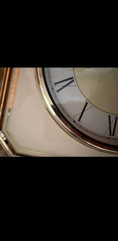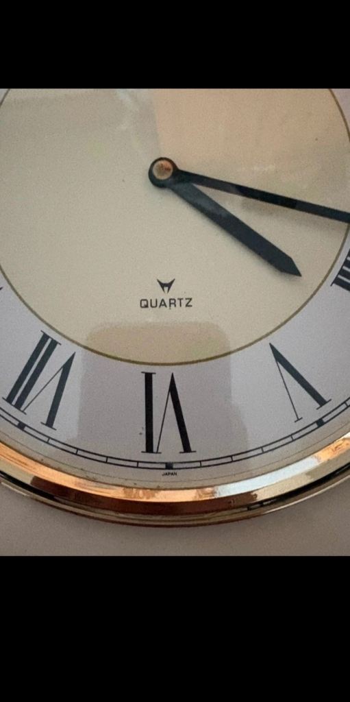 Beautiful vintage wall clock from the renowned Japanese brand Rhythm. A classic square design with a polished gold-tone frame and a crisp white face featuring Roman numerals.