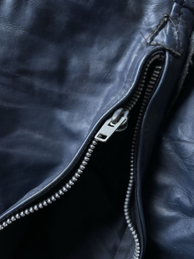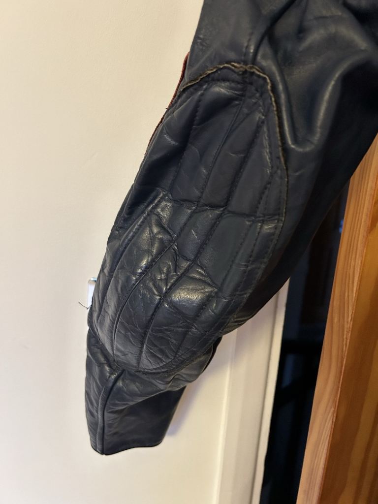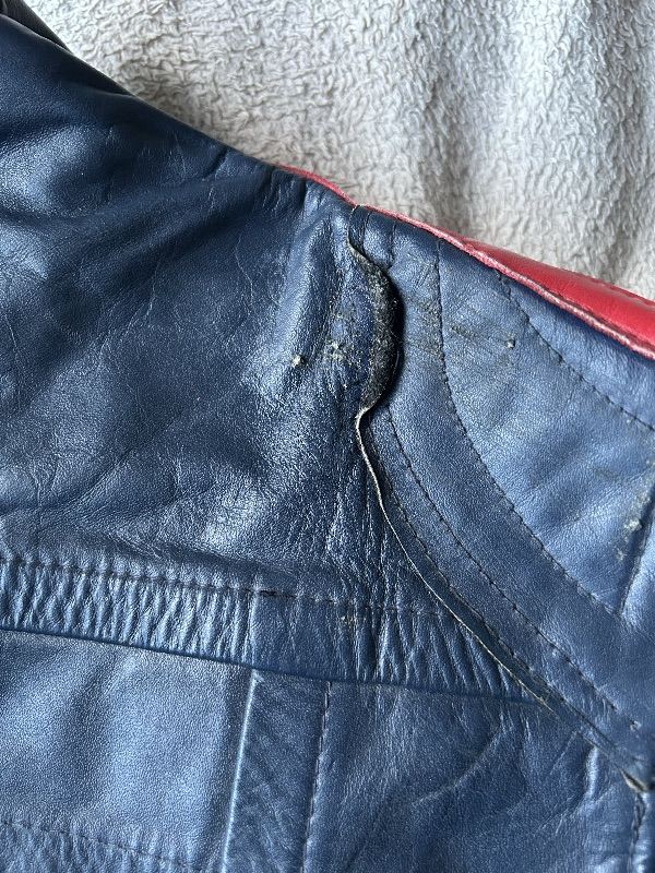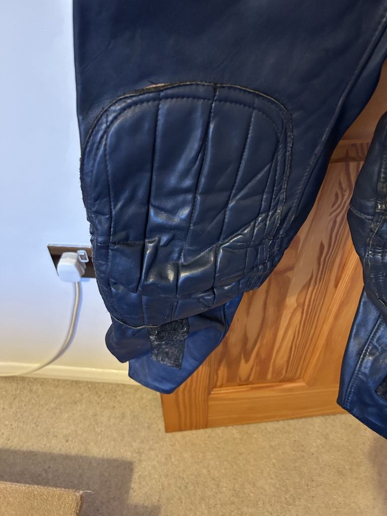 This is a classic 1970s motorcycle leather racing suit. Size 36, it is dark blue with 2 red stripes along each arm. The suit has reenforcement patches at the shoulders, elbows, hips, knees and bum. It is in very good condition for its age and hasn't been worn since the mid 70s. With the exception of 1 zip on the right leg, all others are in good condition. There is a scuff to the right shoulder, the result of a tumble. Buyer collects and cash only please.