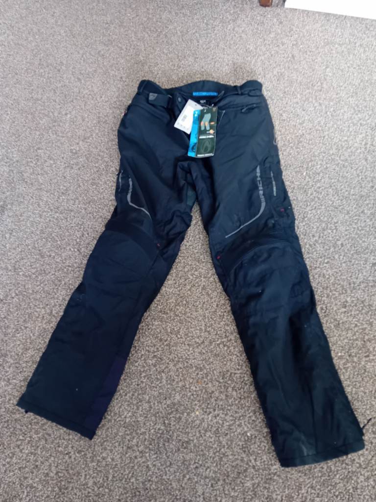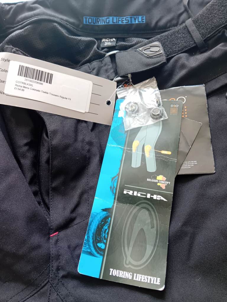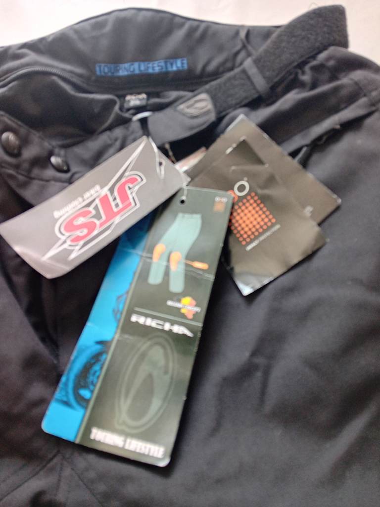 Brand new Richa textile motorbike trousers by JTS: labels still on. Knee pads instead. Thermal zip in lining for cooler months.