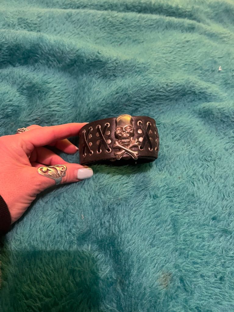Posting for 19+ yearsBlack skull biker punk rocker goth festival leather wristband bangle bracelet unisex