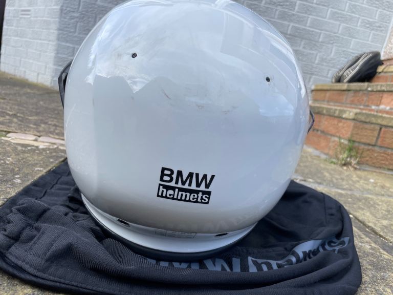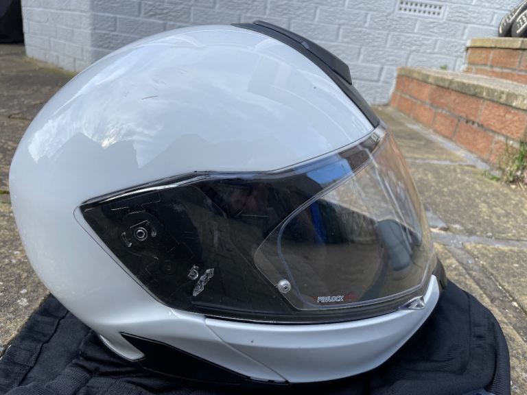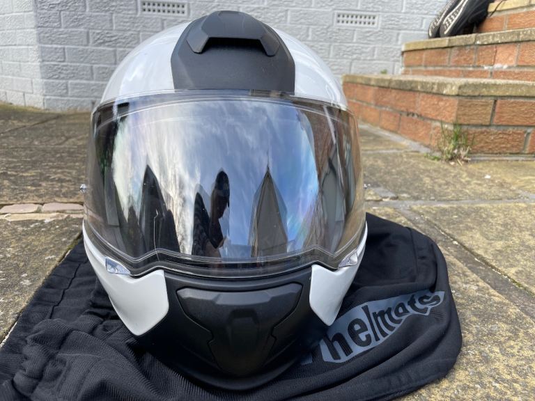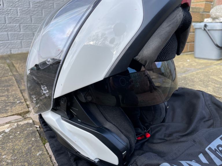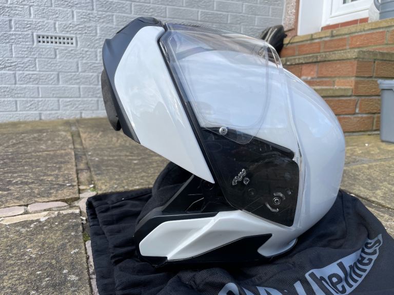 Size 52/53 XS, white, in good, clean condition. Flip up operation with integral sun visor. Black plastic trim at rear is missing and was purely for aesthetics. Helmet bag included. Uplift only.