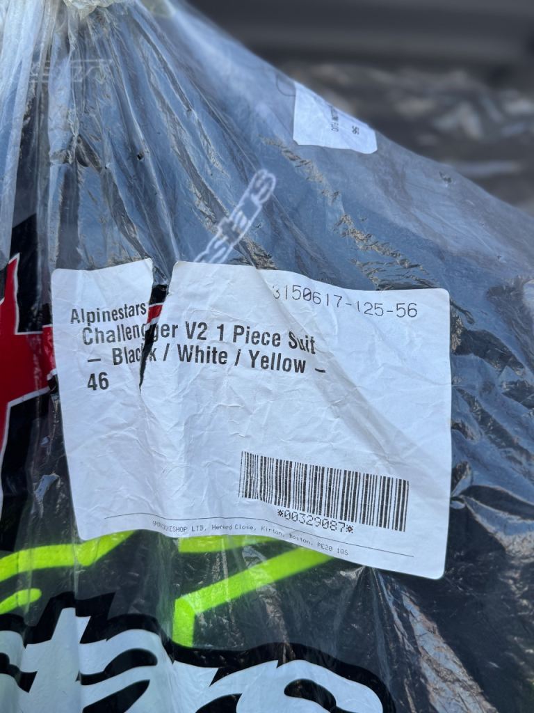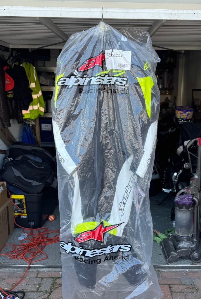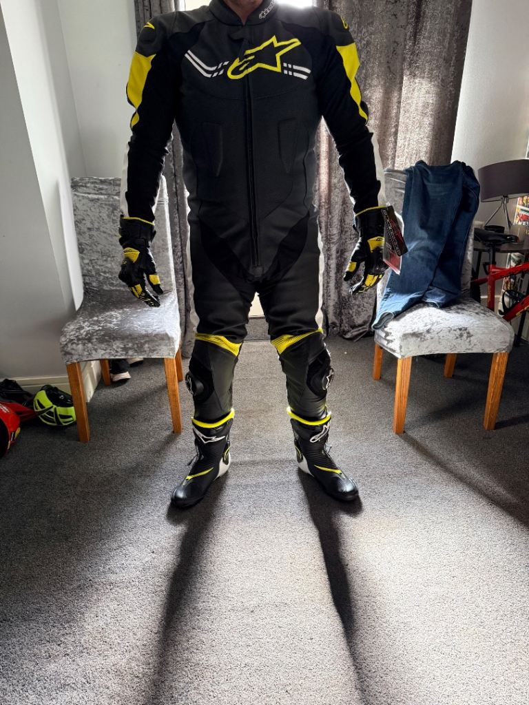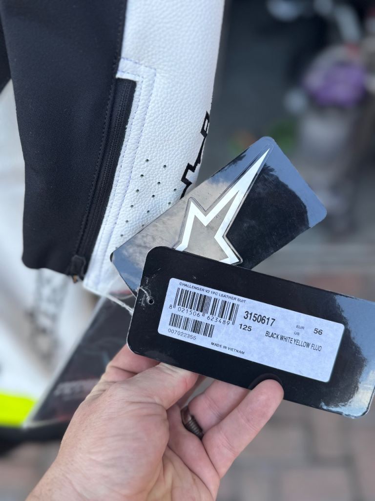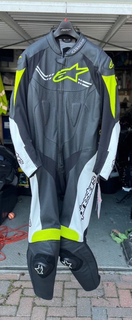 Brand new Alpinestars Challenger V2 1-piece leather suit, never worn and still with tags.
