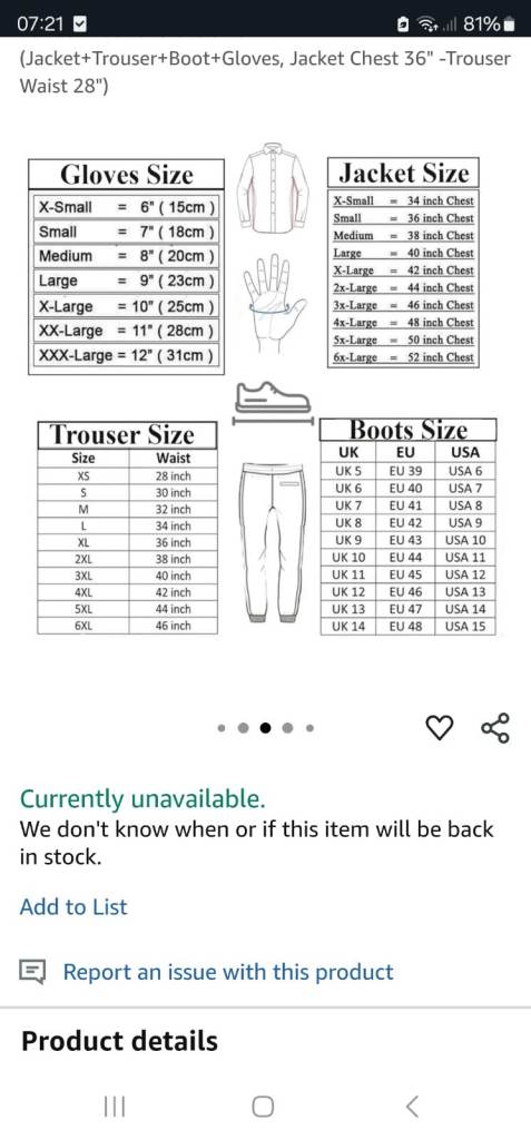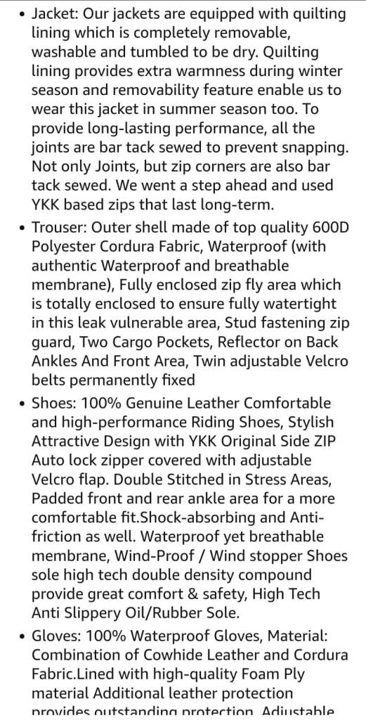 Please see screenshots that has further details about the outfit. I also have a brand new bluetooth motorcycle helmet too for the same price. Perfect set for someone either new to riding or just wanting an upgrade!