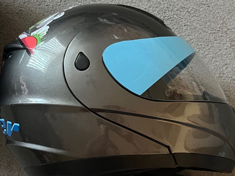 For sale is a full front child’s size small motorcycle helmet with visor opening and full front opening too the chin strap is in a good condition as are the pads inside.