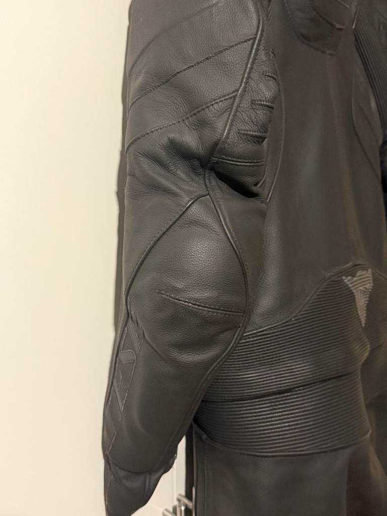 Condition: Used but well looked after. The leather is still supple and healthy. There are some cosmetic scuffs on the shoulder plates and knee sliders (see photos), but no rips or tears in the leather. All zippers work perfectly.