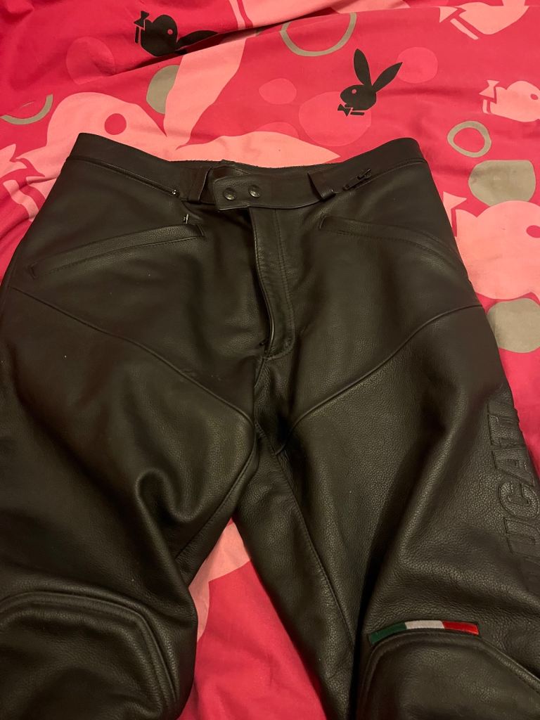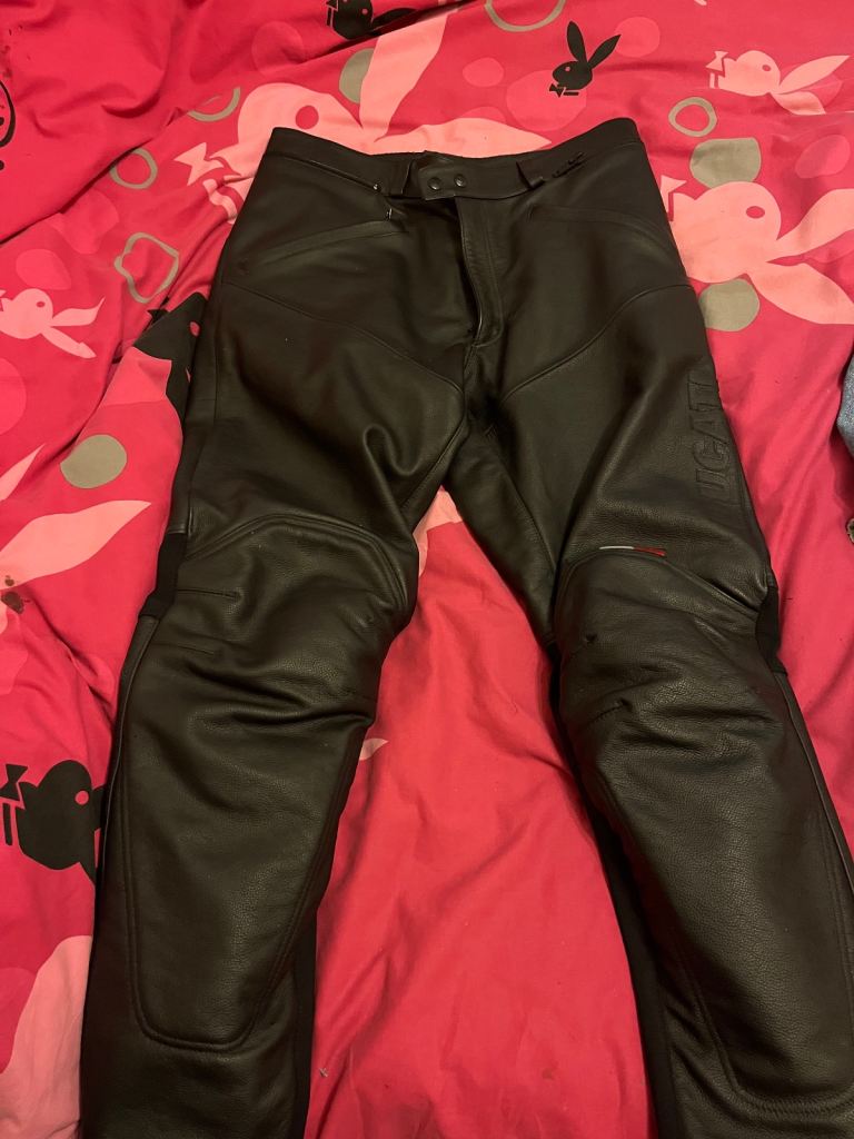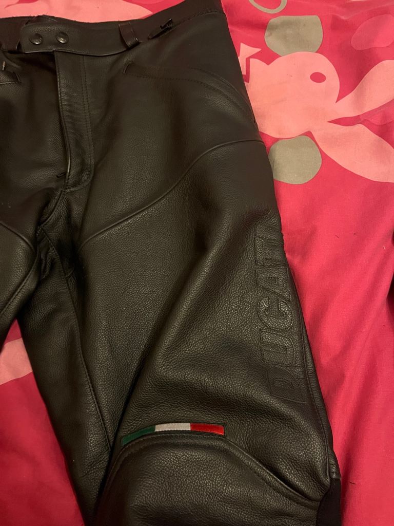Pair almost new condition Ducati motorcycle trousers made in Ukraine size 54 as can be seen in pictures they also have zips on back for easy fitting make great gift for someone or good replacement pair at bargain price welcome to view afternoon/evening I’m in mospark no PayPal or posting or delivery no transport leg length 28-1/2” £50 Ono size 54 is waist 37/38