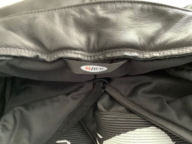 Furygan leather and stretch textile motorcycle trousers . As new and only worn once . Excellent unmarked condition . Size says eu 46 but fits a 34 uk waist . Connecting zips to attach to a motorcycle jacket .