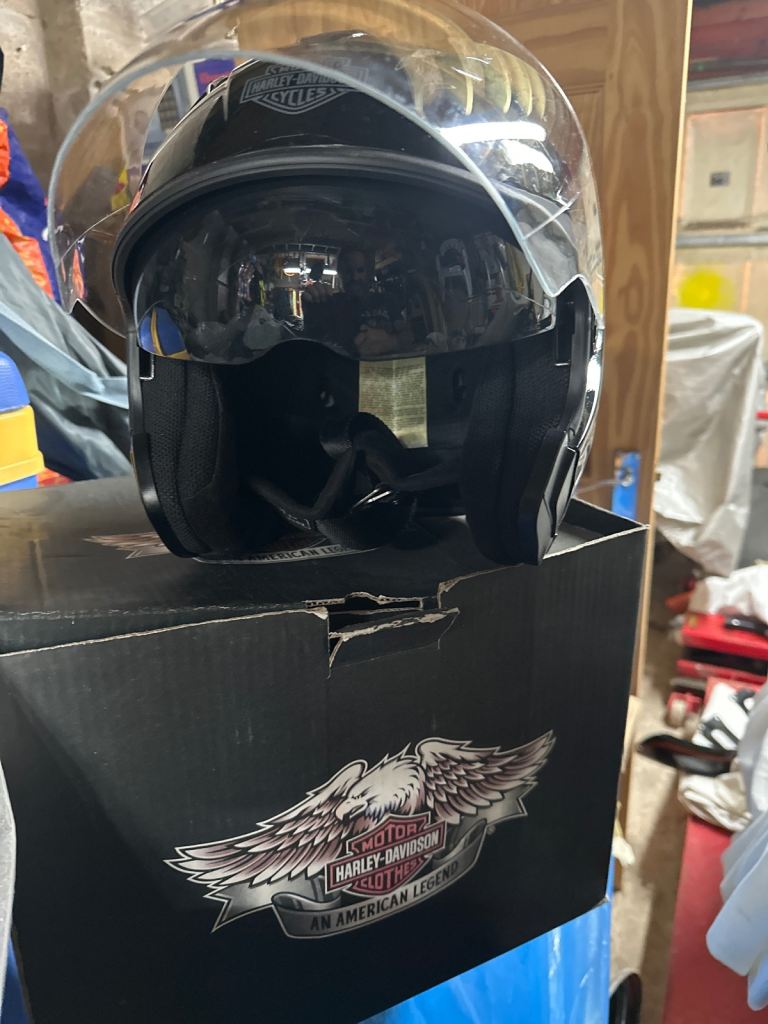 Harley Davidson open faced helmet hardly worn has dropdown tinted sun visor + normal visor + spare new one,has bag and box XXL