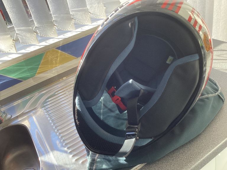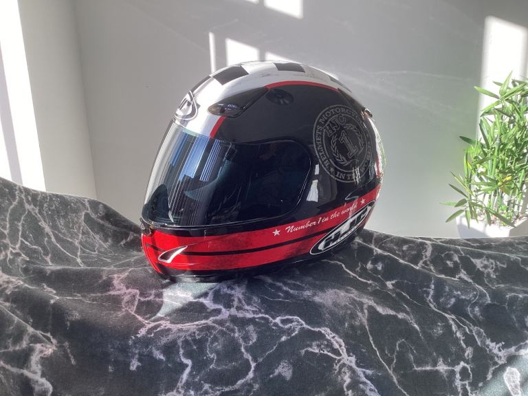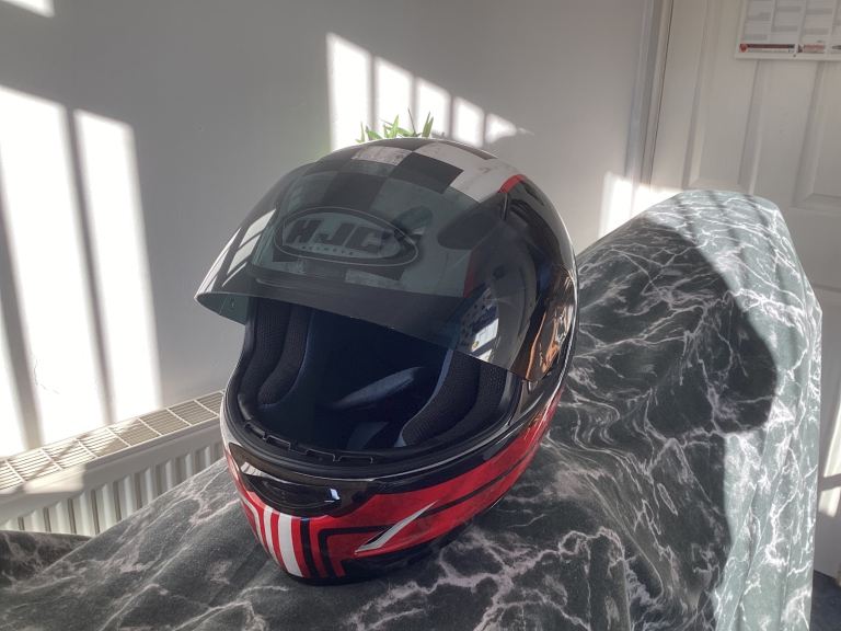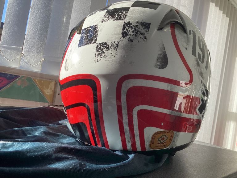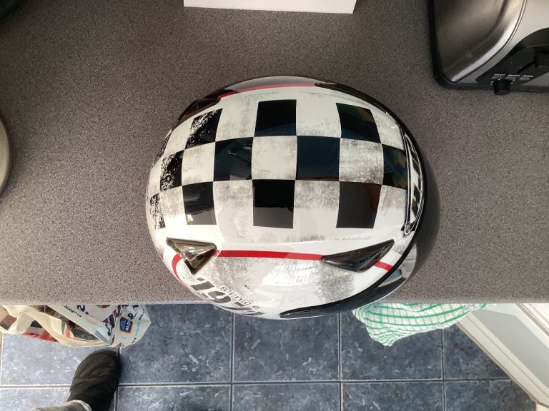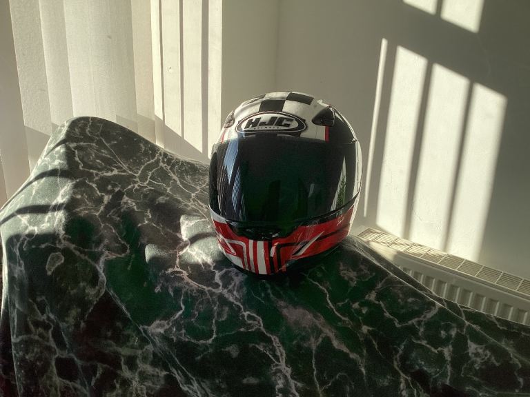 HJC limited anniversary chequered flag design lid , size small ! Worn twice from new by girlfriend. Bike now sold and house move forces sale ! Comes with quick release chin strap and is unmarked, hence is in ‘as new condition . Was £219 when bought and is not a bottom of the range helmet. Great Christmas present!