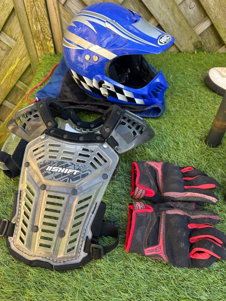 Posting for 11+ monthsKids motor cross helmets x2 and body armour and boots and gloves