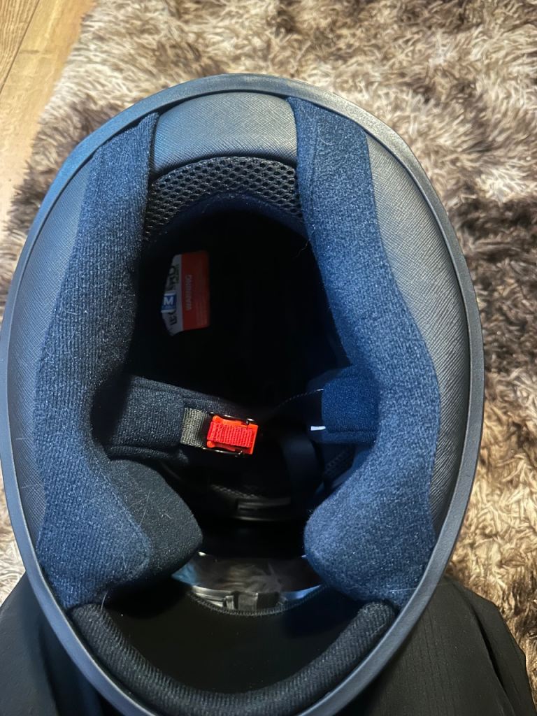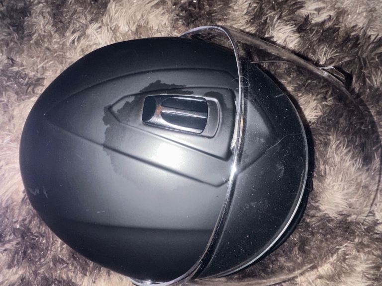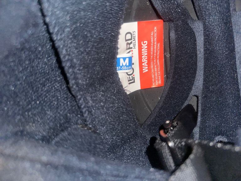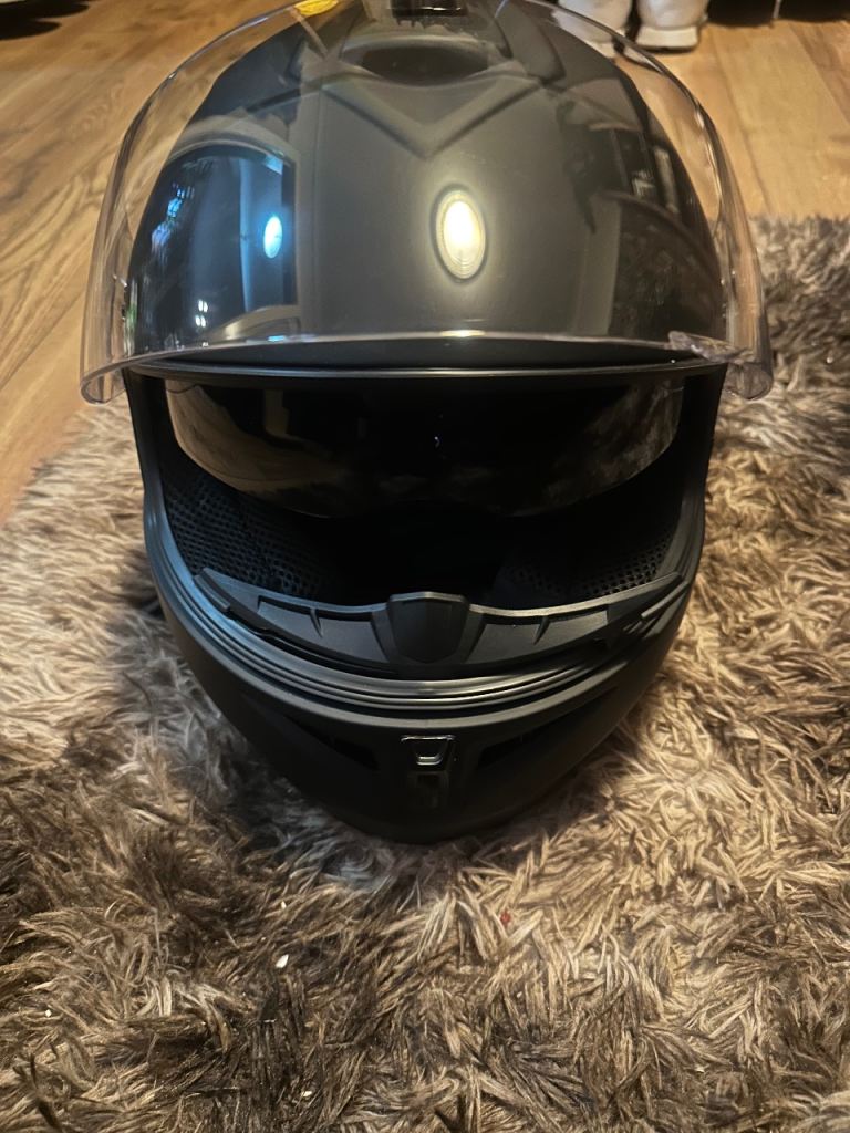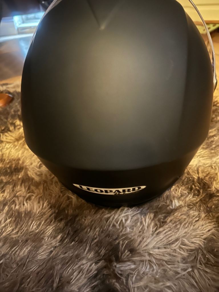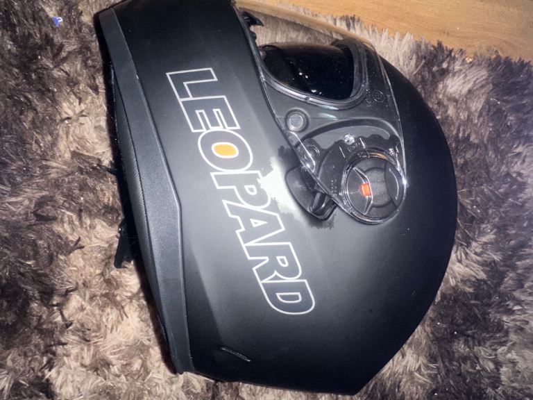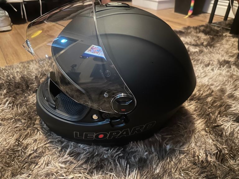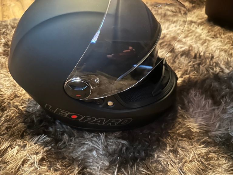 Brand new leopard motorbike helmet , in helmet bag , Matt black , size medium , quick release chin strap , anti scratch clear outer visor and dark smoke inner visor , removable and washable inner liner , adjustable ventilation system