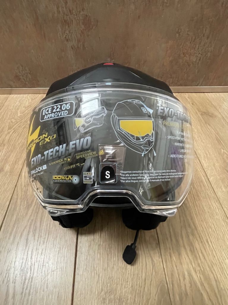 Scorpion Exo-Tech Evo helmet. Matt black. Small. Fitted with Cardo Spirit HD Bluetooth headset. New and unused and in original box with protective storage bag.
