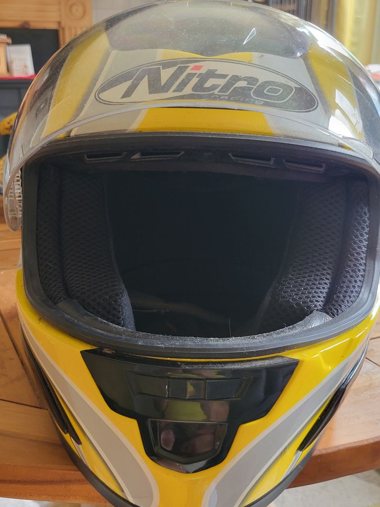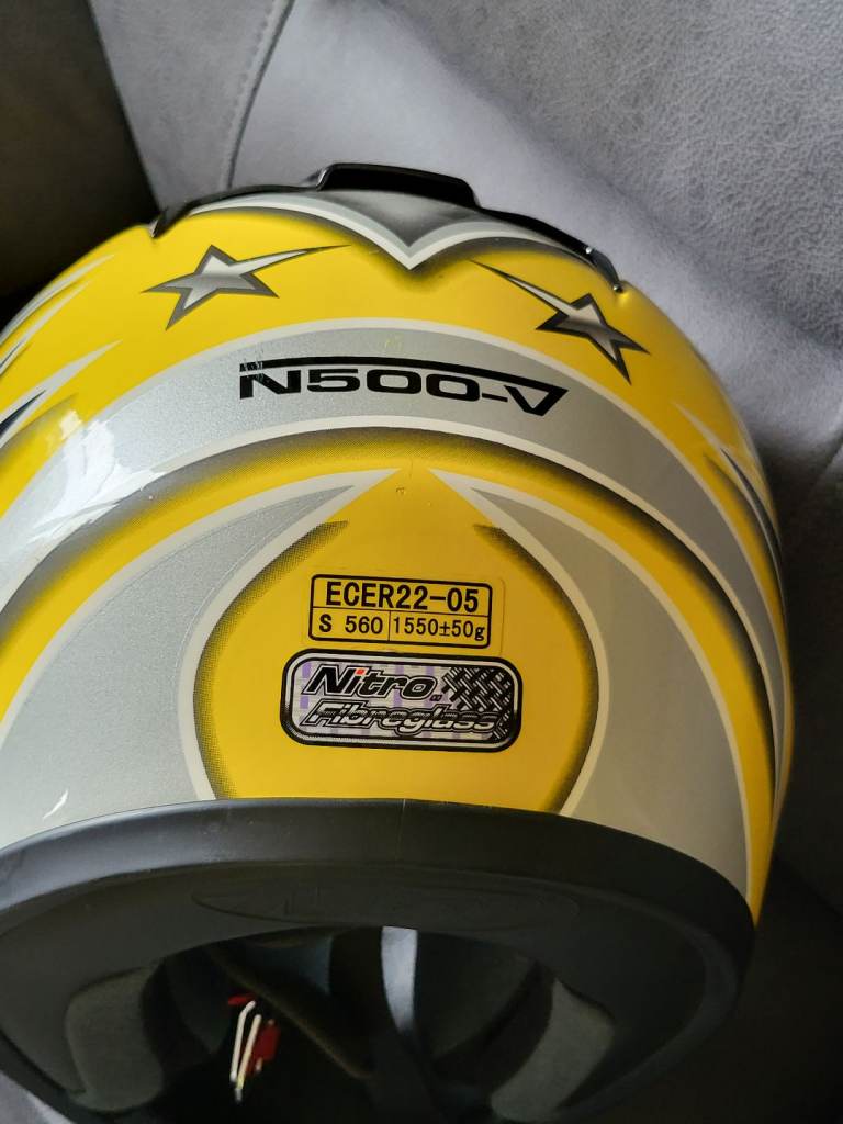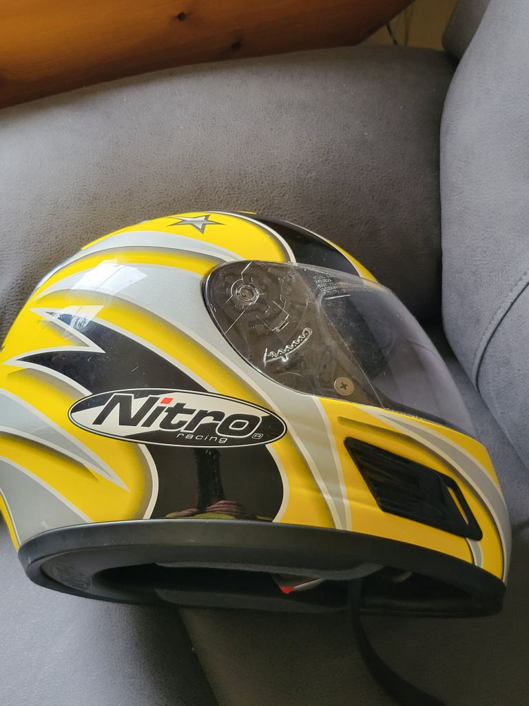 Nitro racing N500-V helmet for sale. Size S worn 3 times by pillion passenger. Comes with carrier/storage cover
