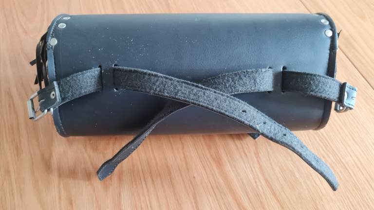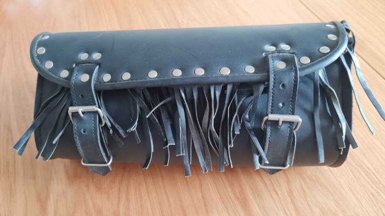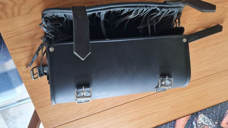 It's in good all round condition I'm not sure if it's leather but looks great with fixing straps fringes and metal studs and buckles collection only please