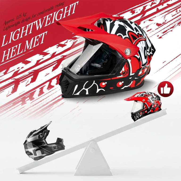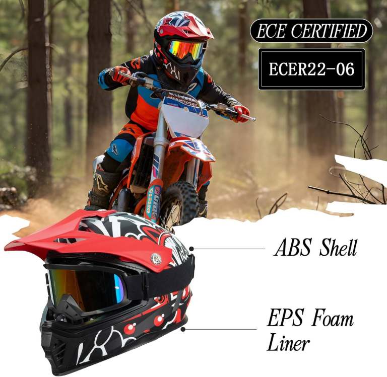 New in packaging - unopened - unused - unworn - Favoto Dirt Bike Helmet Kids - Full Face, ECE Approved, with Visor & Sun Peak, Go Kart & ATV, Boys & Girls Youth, Lightweight ABS/EPS, Removable Liner, Red/Black (S) - size 49-50cm