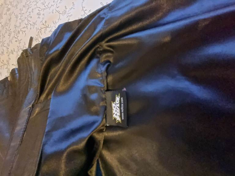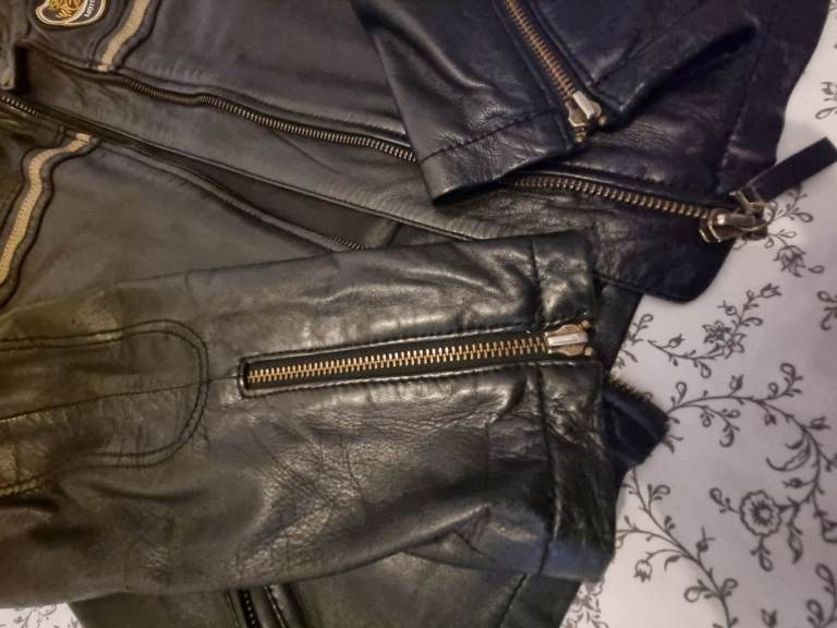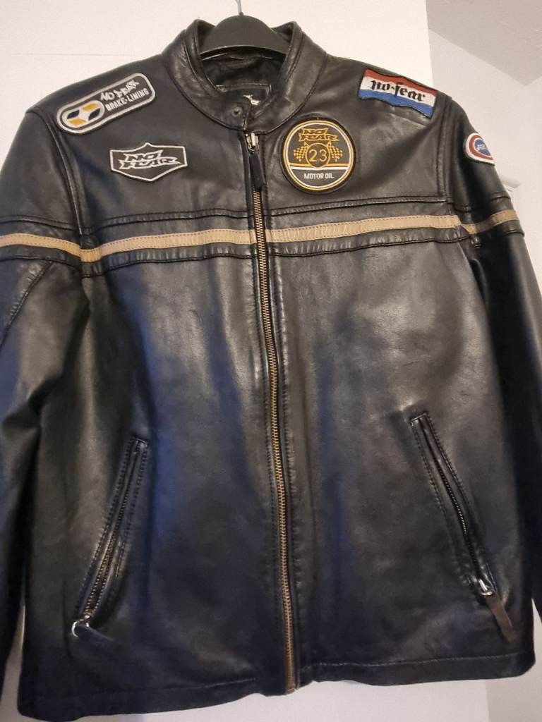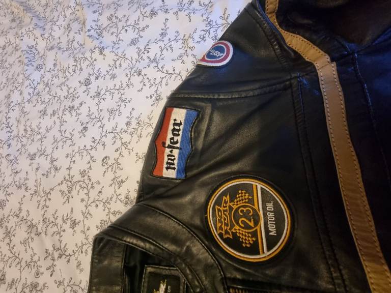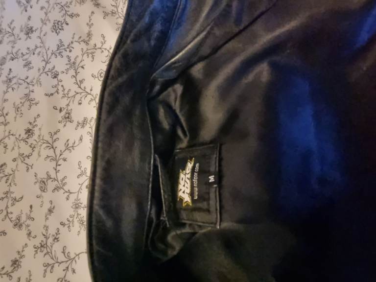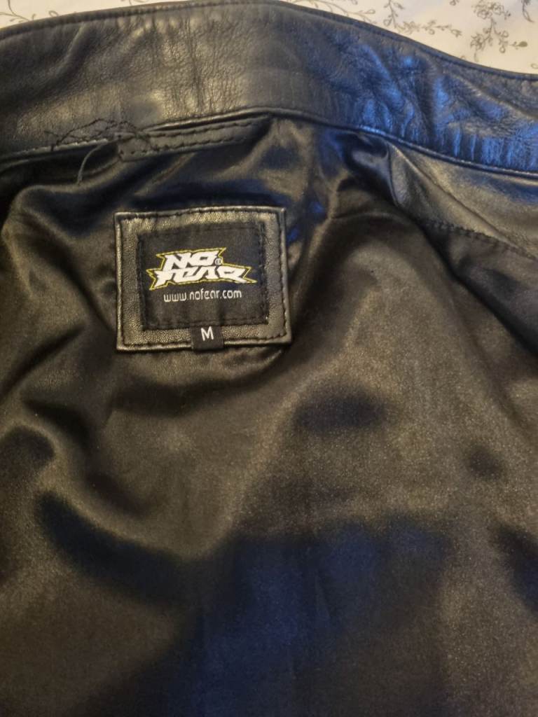 Lovely no fear soft 100%"leather motorcycle jacket in very good condition size medium zip up front zips on the side of arms pockets inside jacket