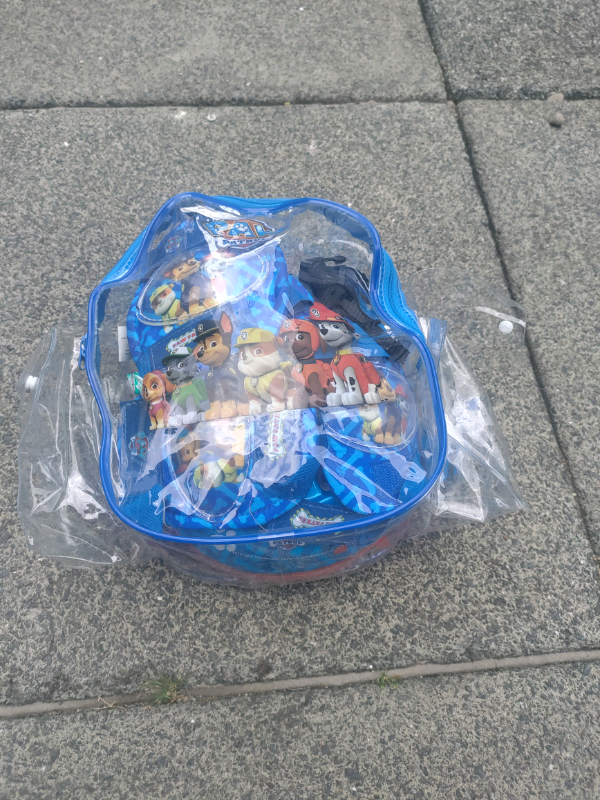 Paw patrol helmet and knee pads and elbow pads complete in a clear paw patrol bag. Hardly ever used.