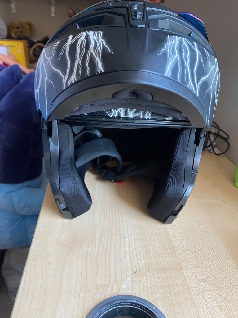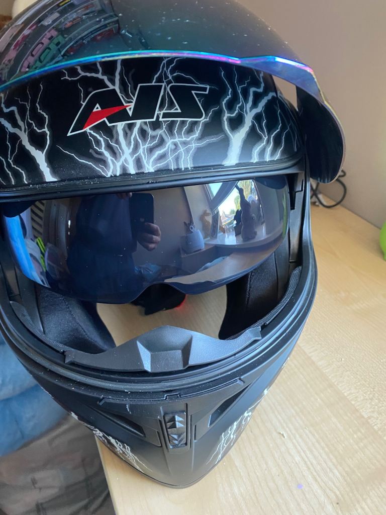 Xl front flip motorcycle helmet used once never dropped , scratched or bumped . Used it once and didn’t like it .has a great lighting effect on it with smoked tint visor for anti glare protection