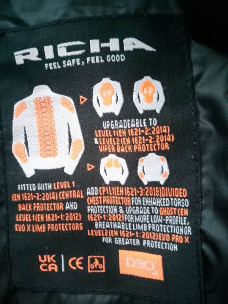 It has lots of armour, shoulder, elbow and back, and two outside pockets.