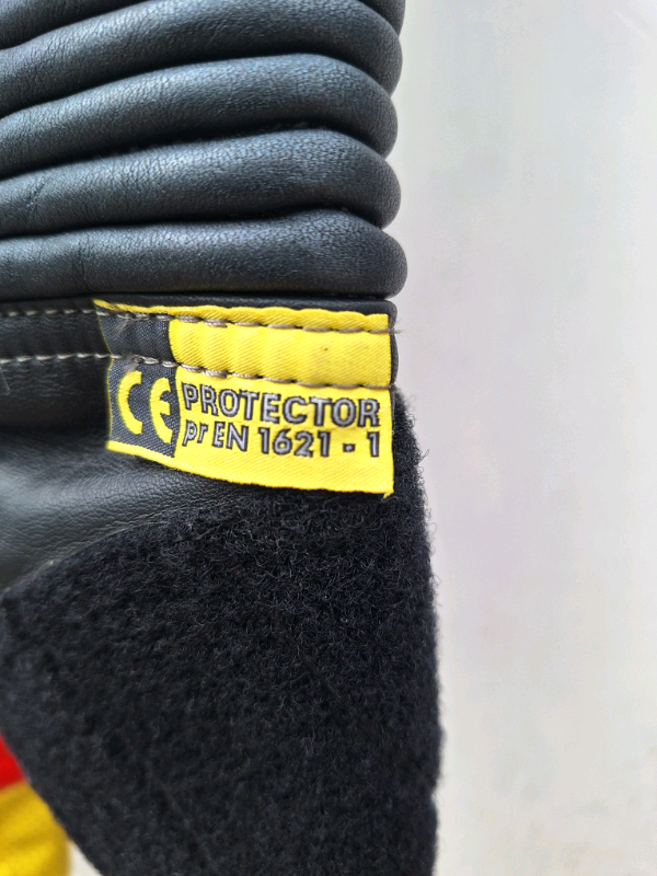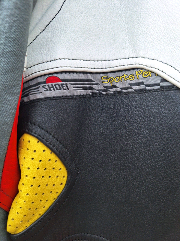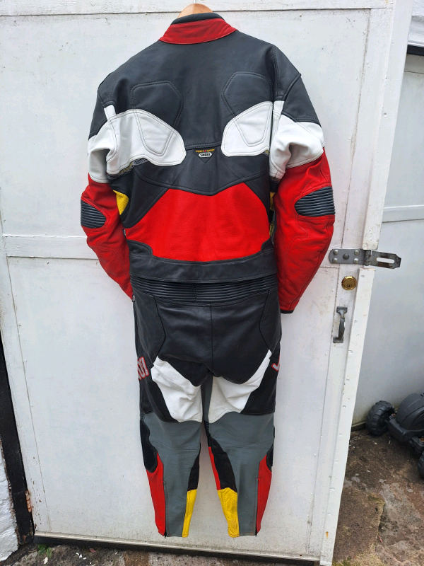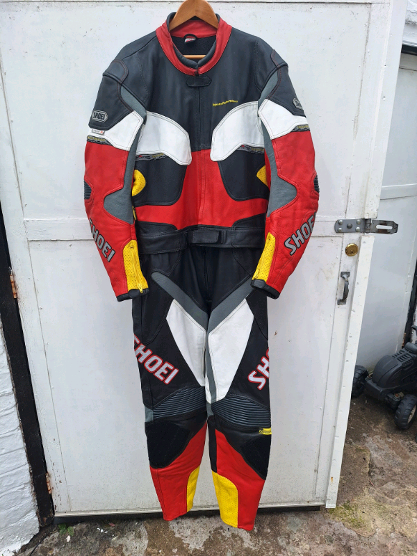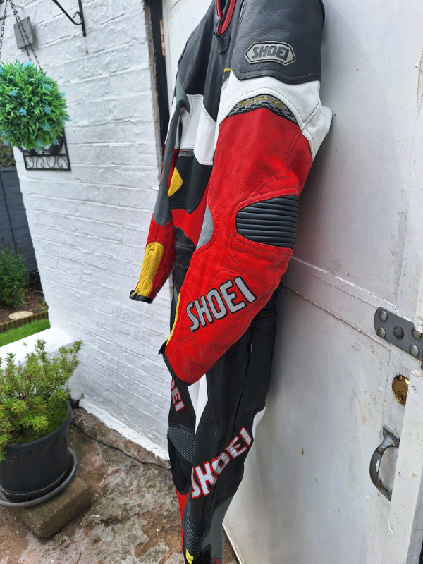 Shoei Motorcycle leathers in excellent condition. 2 piece that zips together as a one piece. All zips and velcro work as they should. Size 58. I am a 34 waist and the jacket is an xl. Thanks for looking.