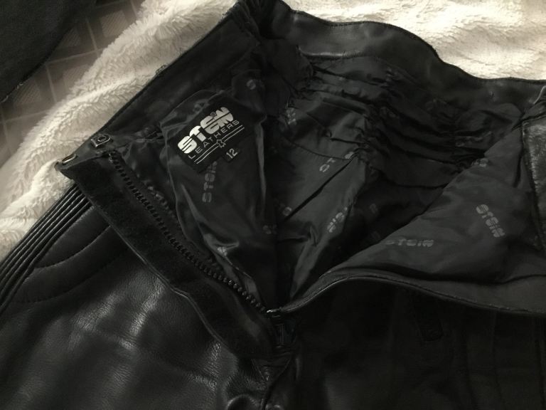 Black Stein ladies leather motorcycle trousers with zip pockets and zipped front fastener with Velcro, also zipped leg fastener Velcro. Size 12 which is small waisted.