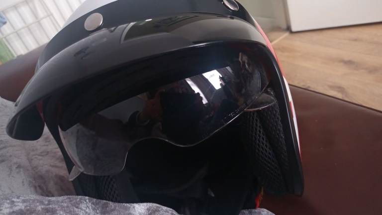 In good condition just been stored in the cupboard the size is 57-58 medium has build in drop down eye shield and visor buyer collection only fibreglass not plastic