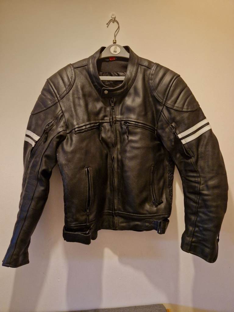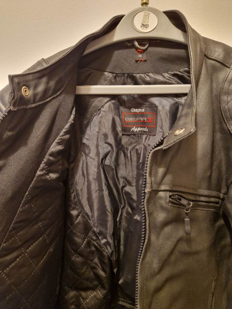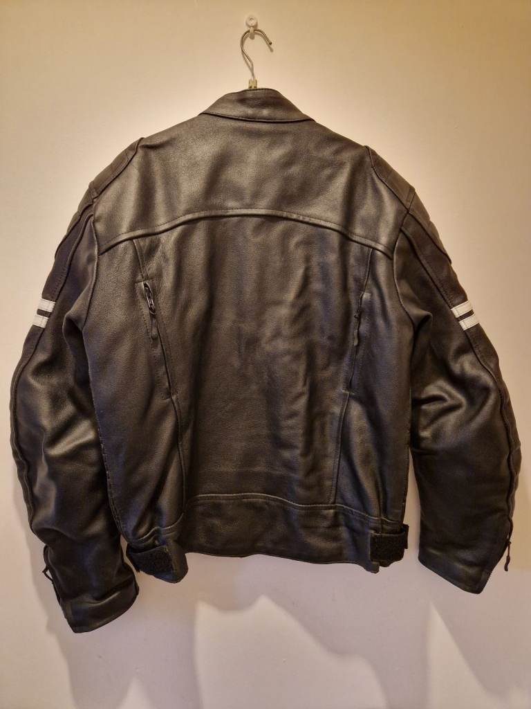 Real leather, very good condition with only slight signs of wear from age. White stripe detailing on the sleeve. Size M.