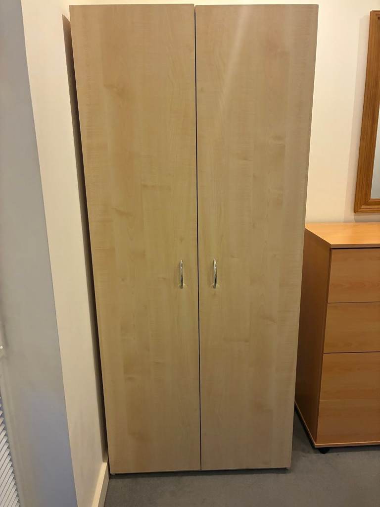 Third, smaller wardrobe: 60w x 50d x 137h (inc. legs), with external shelves + internal shelves with natural wood doors.