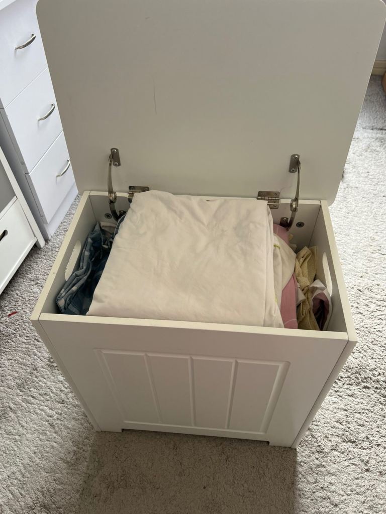 Brand new in the box laundry storage box. Closed the business permanently and trying sell the stock at the purchase price. Made of MDF. Colour cream white. Size 53cmX47cmX10.7cm. Send me a message if you have any questions? You can collect from the Glasgow southside or we a St coast of Scotland, Tarbert, Argyll