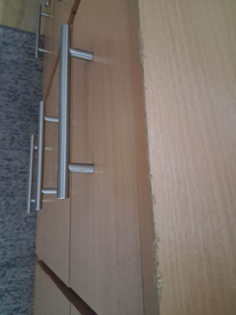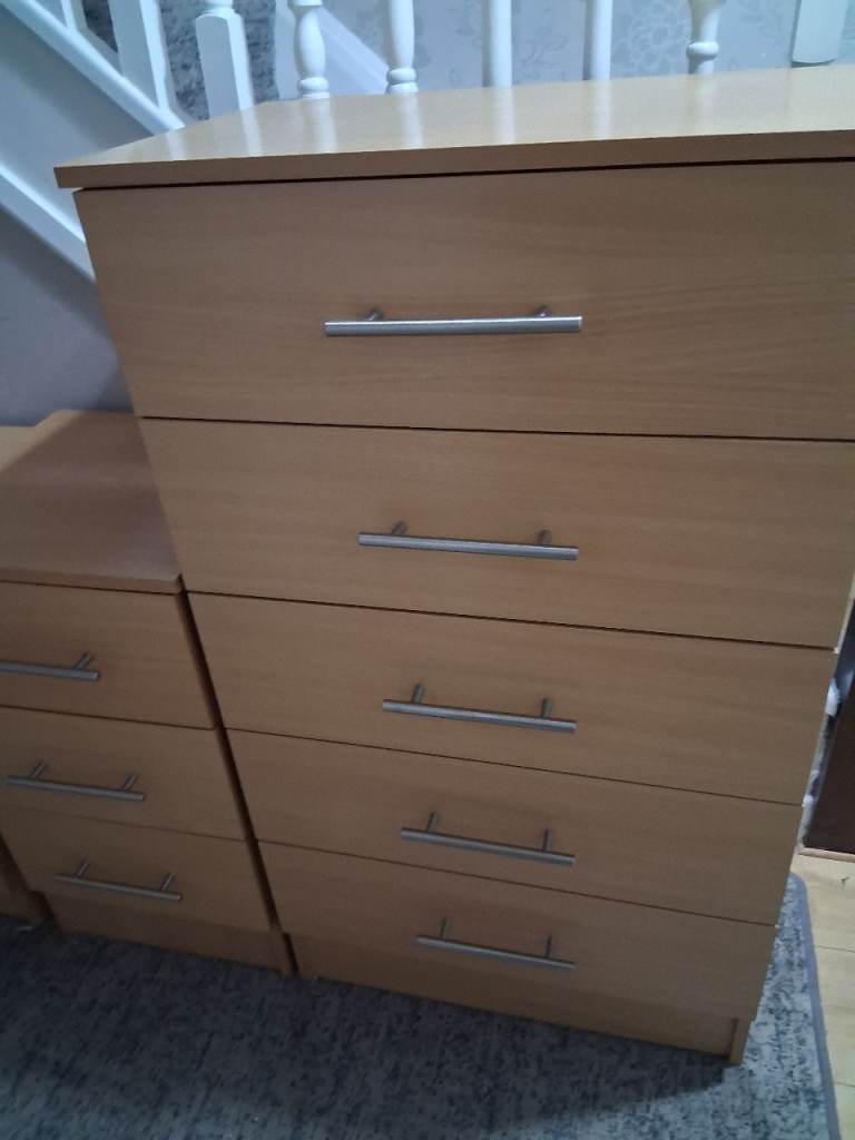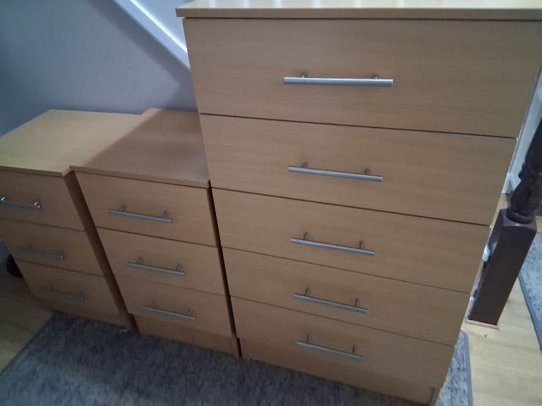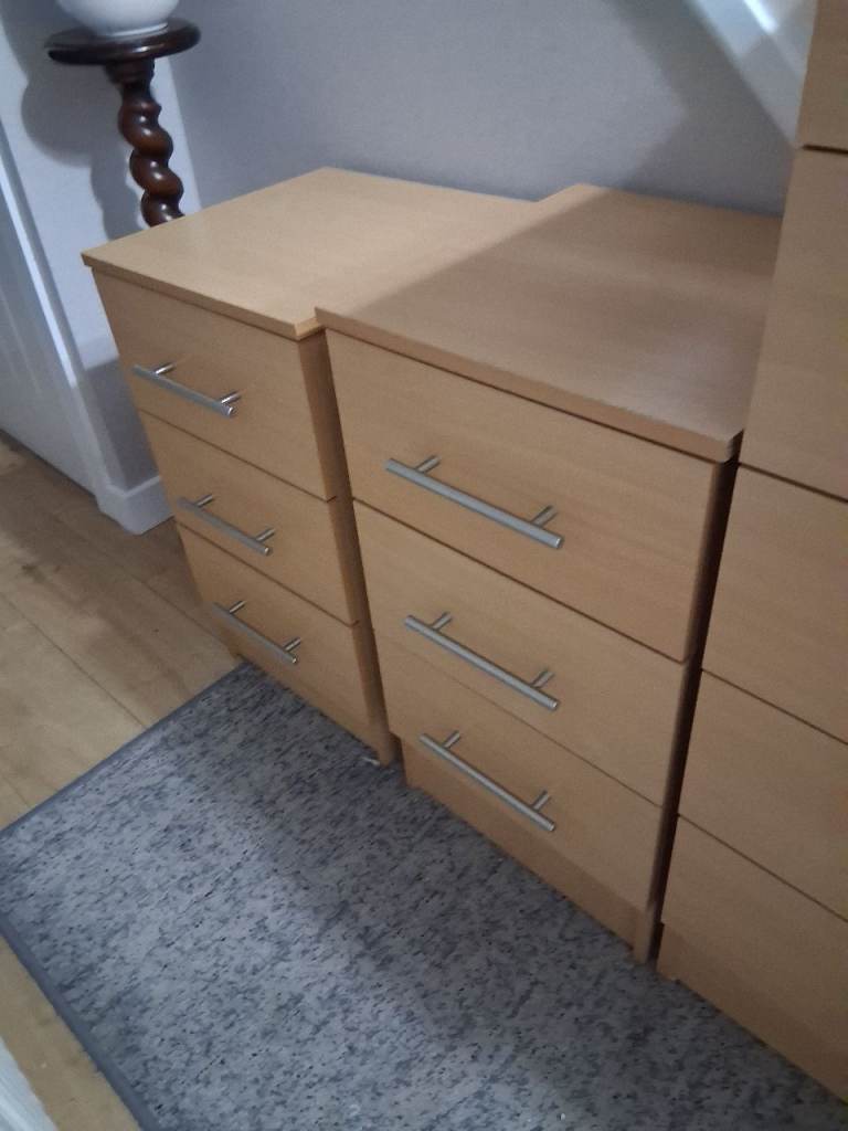 All the above were bought fully assembed ( not flat packed ). Beech coloured with silver handles. Bedside table 1 is 3cm taller than bedside table 2. Bedside table 1 has small chips to front of top edge as shown in the picture.