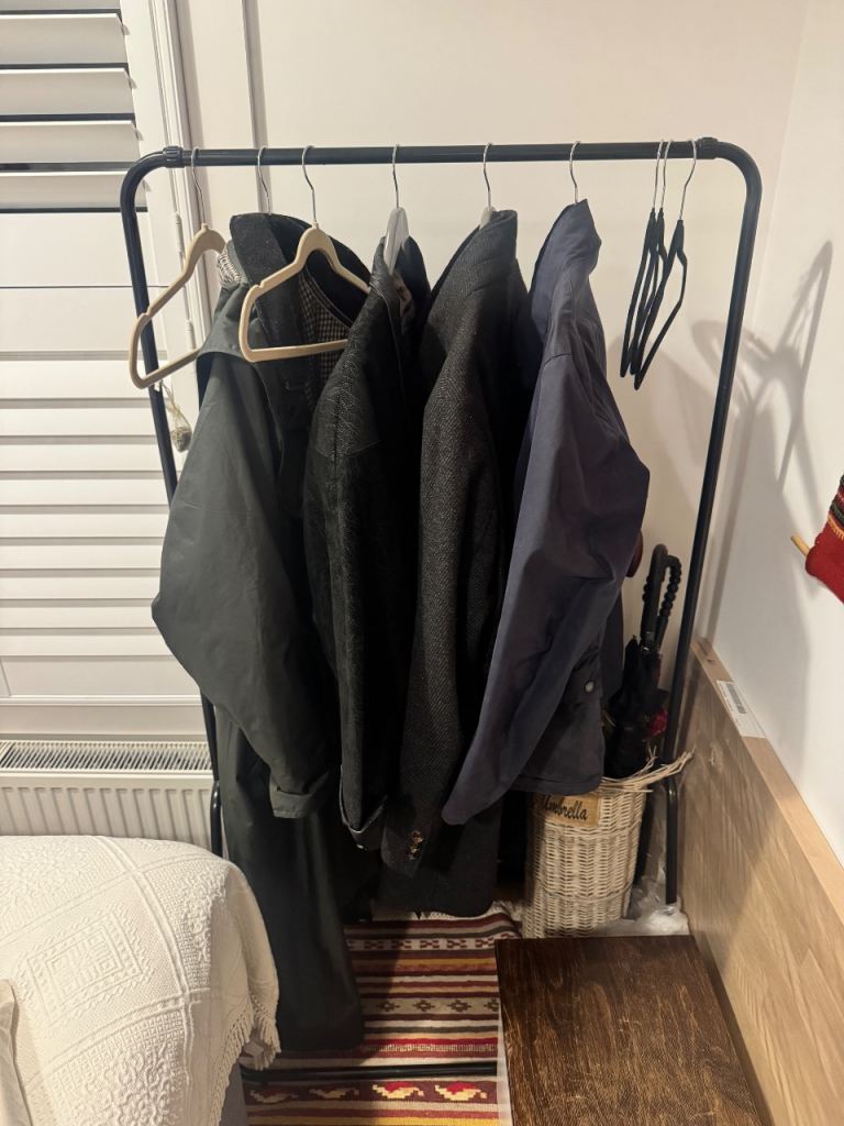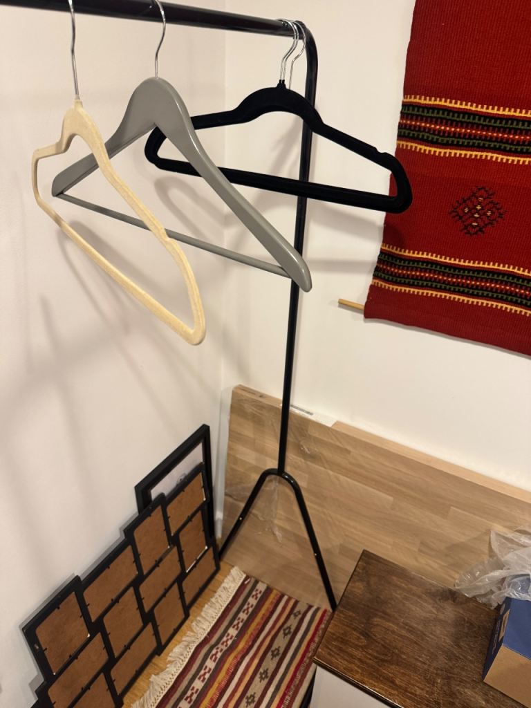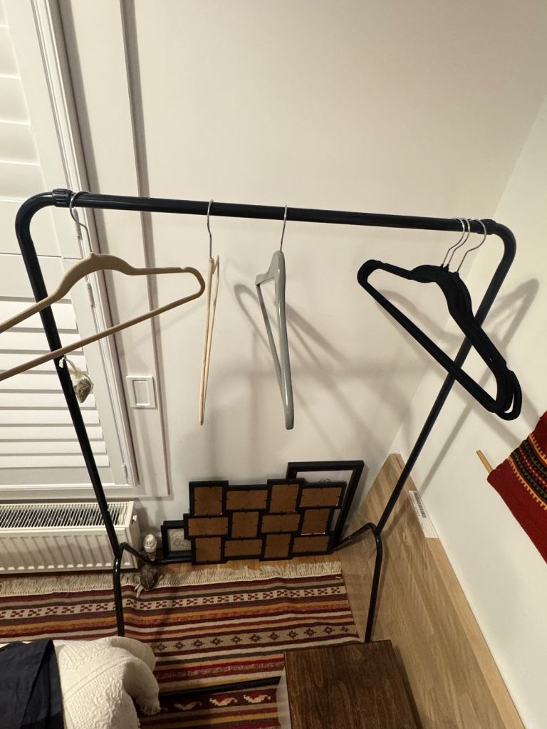 Black free standing clothes rail. Fits into small spaces. Can be dismantled. Collection only.
