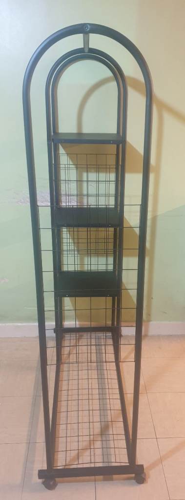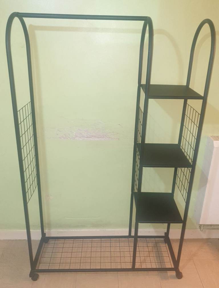 Black metal clothes rail with 4 shelfs and a shoe stand at thee bottom very good condition