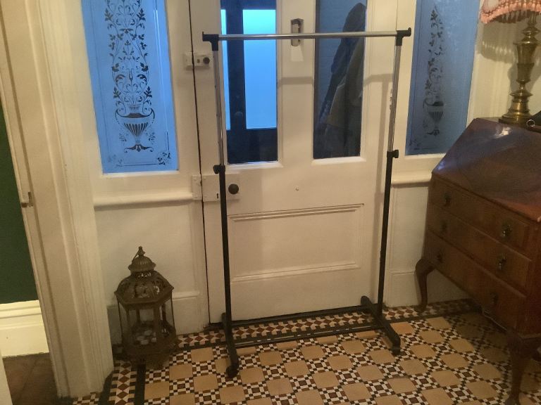 Clothes rail made of metal and plastic the length is 78 cms you can take it up and down in height with the side handles