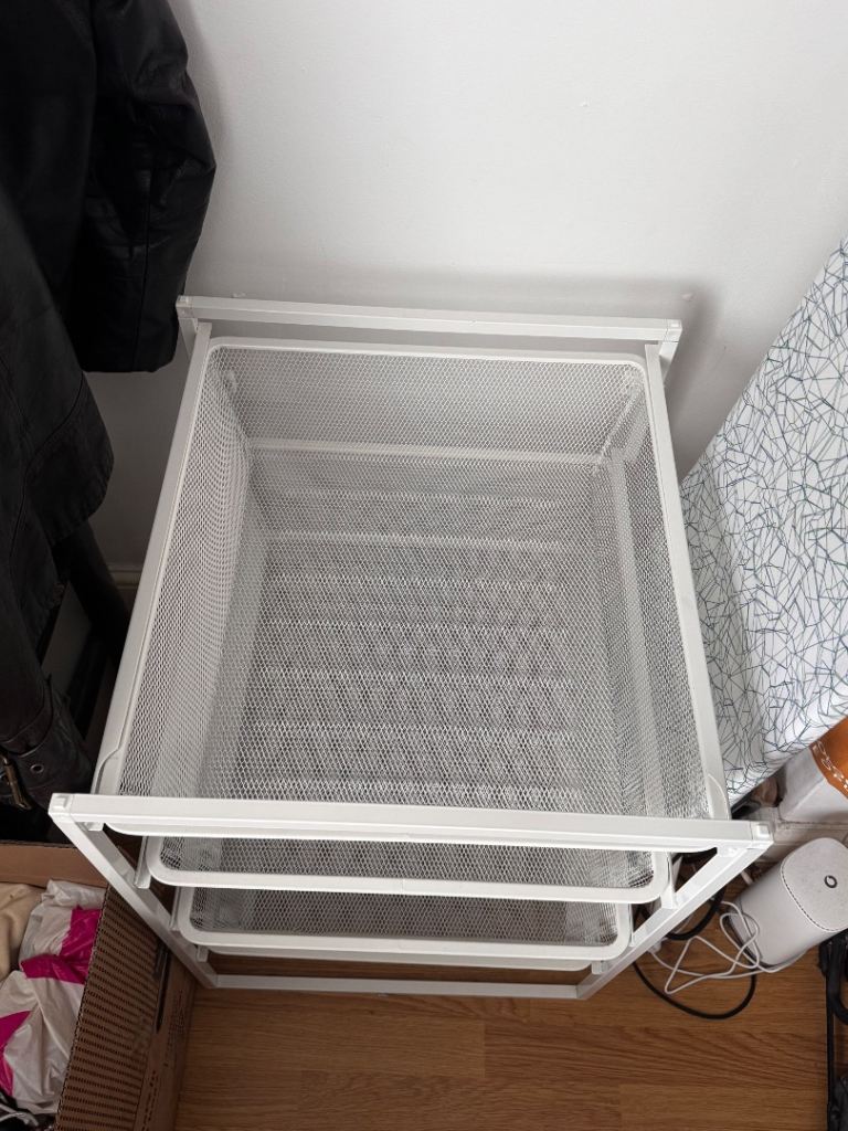 Features a strong white metal frame with four mesh basket drawers.