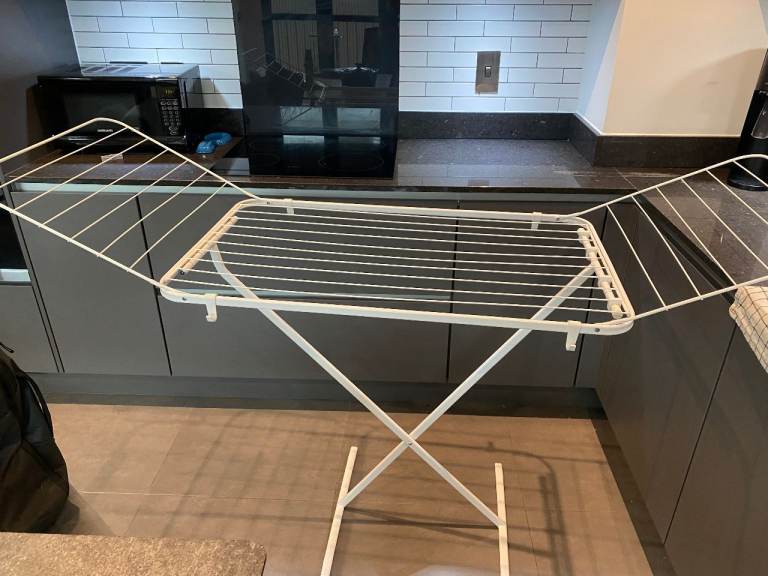 Practical and sturdy drying rack in great condition, perfect for air-drying clothes at home or outside. Lightweight and easy to fold away when not in use, making it ideal for saving space.