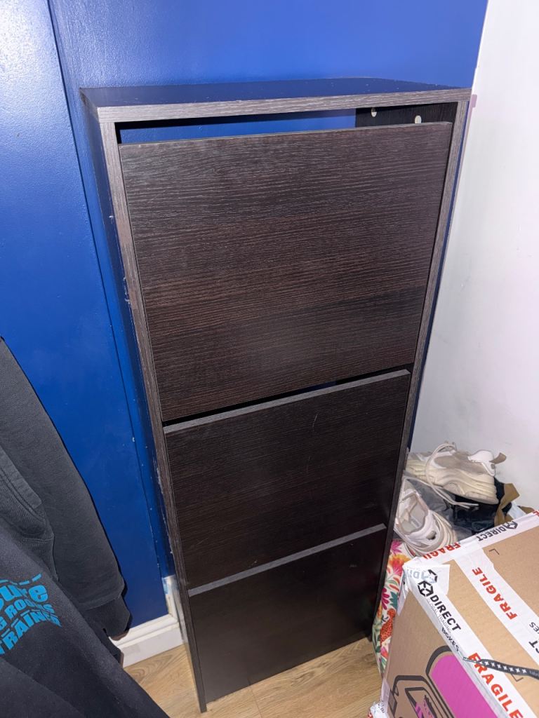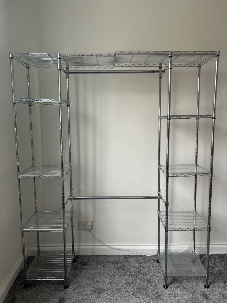 Includes adjustable interior fittings suitable for hanging clothes, shelving, or storage boxes. The sliding doors operate smoothly and save space, making it a practical choice for tighter rooms.