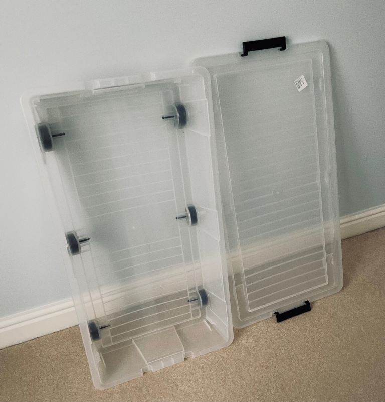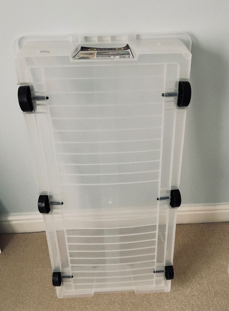 This is a well made plastic storage box perfect for under beds. It has removable lid, clip on lid handles & six small wheels for making it extremely easy to move especially when full. It measures 45cm wide, 18cm high & is 84cm deep.